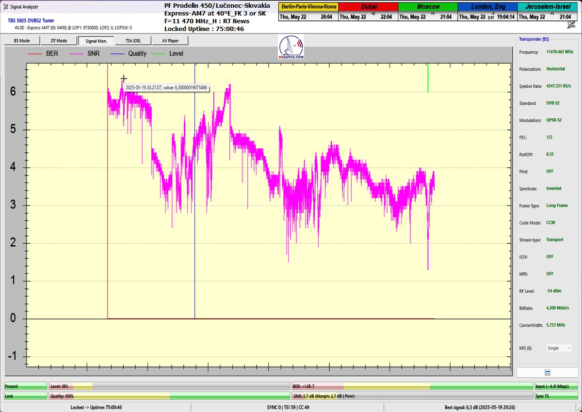 >DE_Verifizierung der technologischen Erfindung „Synchron-Nanokorrekturen“ durch den Wissenschaftler und Erfinder Roman Dávid aus Lučenec beim Satellitenempfang aus dem Footprint von NORTH Africa in Mitteleuropa, wo sie sich als einziger Garant für die Erreichung einer Empfangsstabilität von 99,99 % unter dynamisch variablen Signalbedingungen mit häufigen und unregelmäßigen Leistungseinbrüchen (EIRP) erwiesen hat.