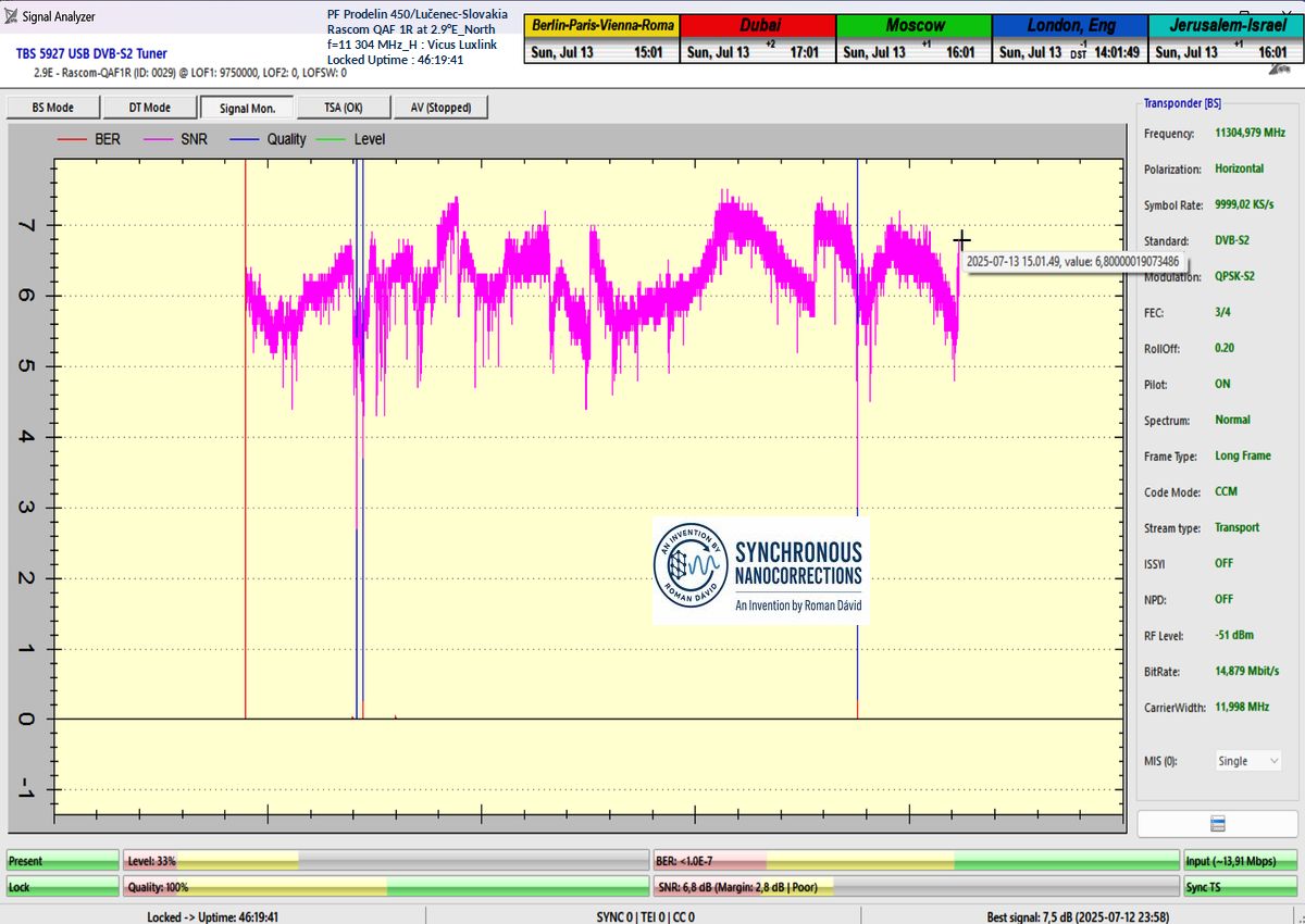SK_Ako potvrdzuje vizualizovaná forma dokazovania v signálnom monitoringu s trvaním t = 79 hodín (čo predstavuje presne 284 400 sekúnd), výpadky v Locku alebo oscilácie kvality v okolí šumového prahu sa vyskytli v celkovom trvaní iba pätnásť sekúnd z celkových 284 400 sekúnd. To zodpovedá percentuálnej stabilite príjmu na úrovni presne 99,99 %.Jediným garantom dosiahnutej stability príjmu na frekvencii f = 11 304 MHz_H je — ako to následne dokazuj— technologický vynález s názvom Synchrónne nanokorekcie, ktorého autorom je vedec a vynálezca Roman Dávid z Lučenca. Tento vynález zabezpečuje náhle a skokové zlepšenia kvality príjmu, ktoré okamžite zvyšujú signálnu rezervu v rozsahu od +0,5 do +2,5 dB.