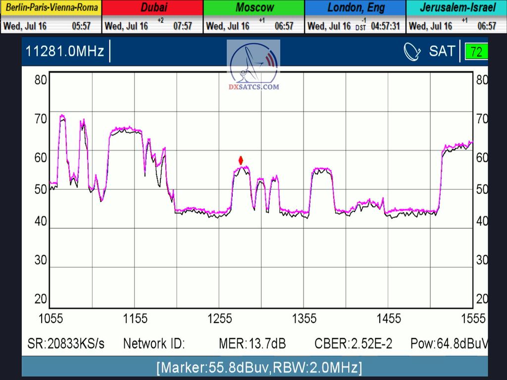 ►As a reference aid for the initial alignment of your satellite reflector to the transmission concentrated in the northern radiation pattern of the Rascom QAF 1R satellite at 2.9°E in Central Europe, this spectrum and quality analysis of the data transmission in DVB-S2/ACM standard on f = 11,281 MHz_H may serve you well,