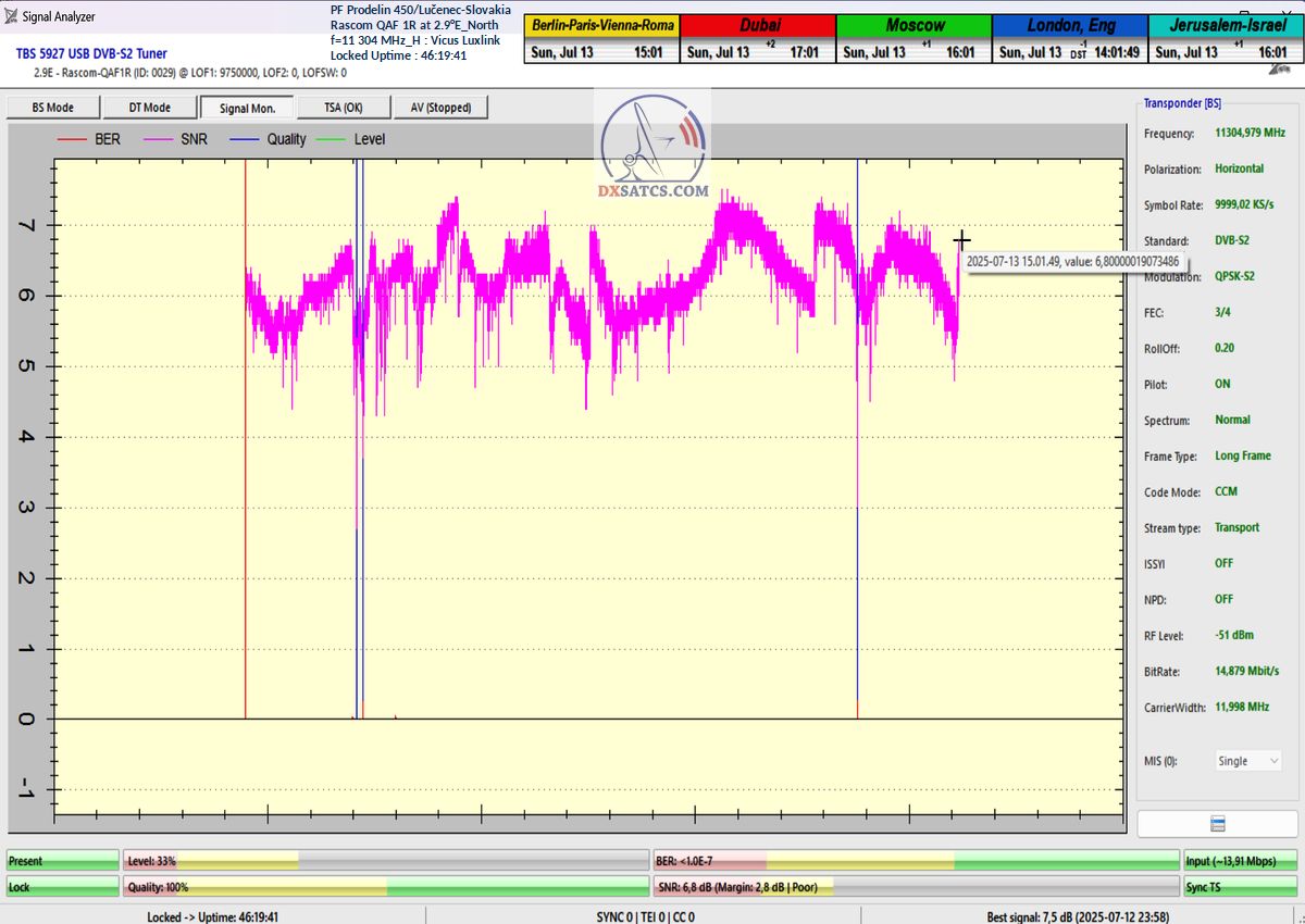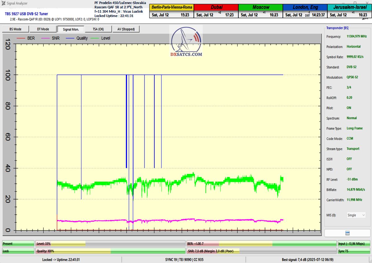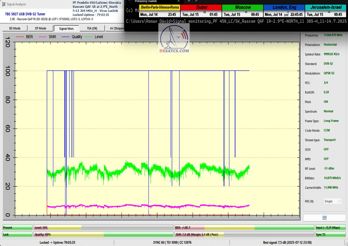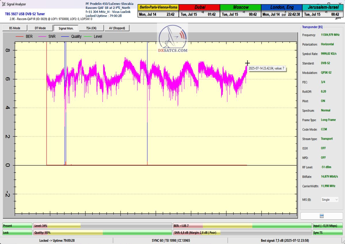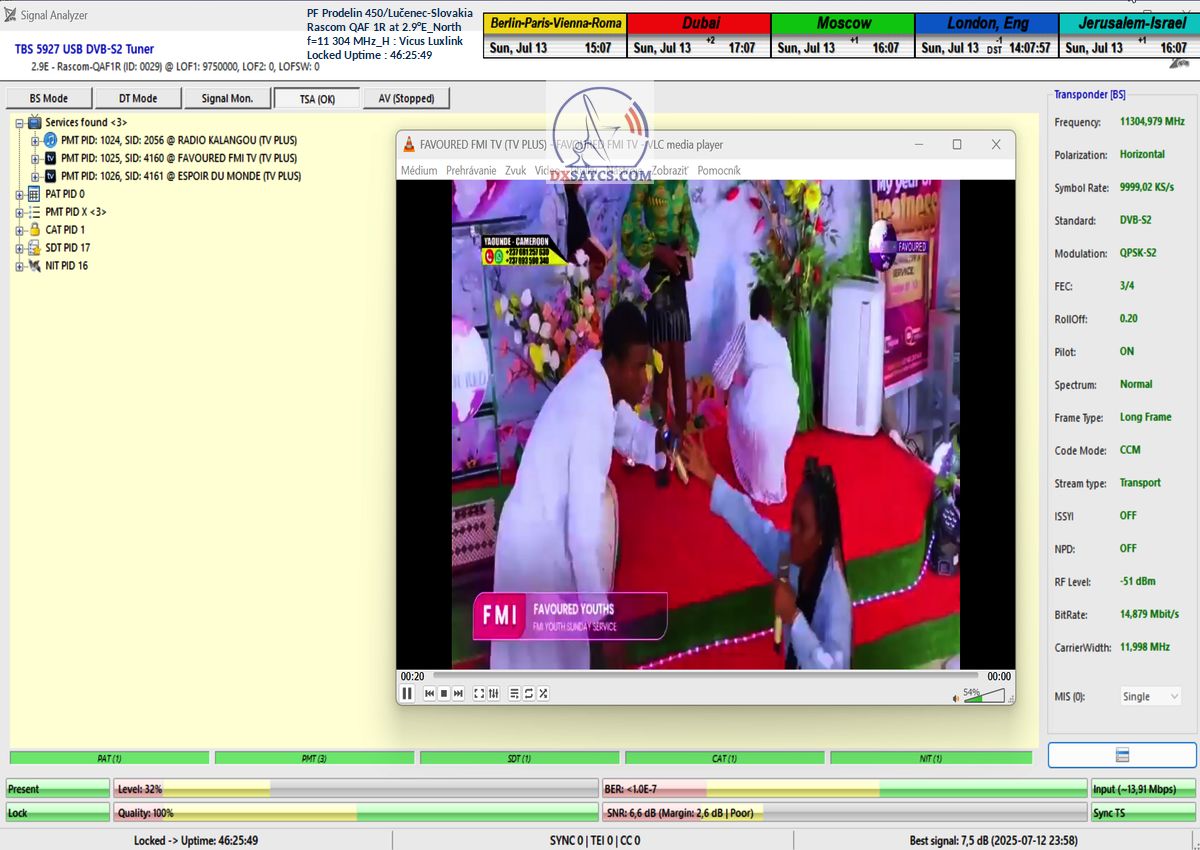 23-7-2025_Rascom QAF-1R at 2.9°E-North Africa-11 304-H: Verification of the technological invention “Synchronous Nanocorrections” by scientist and inventor Roman Dávid from Lučenec during satellite reception from the NORTH Africa beam in Central Europe...
