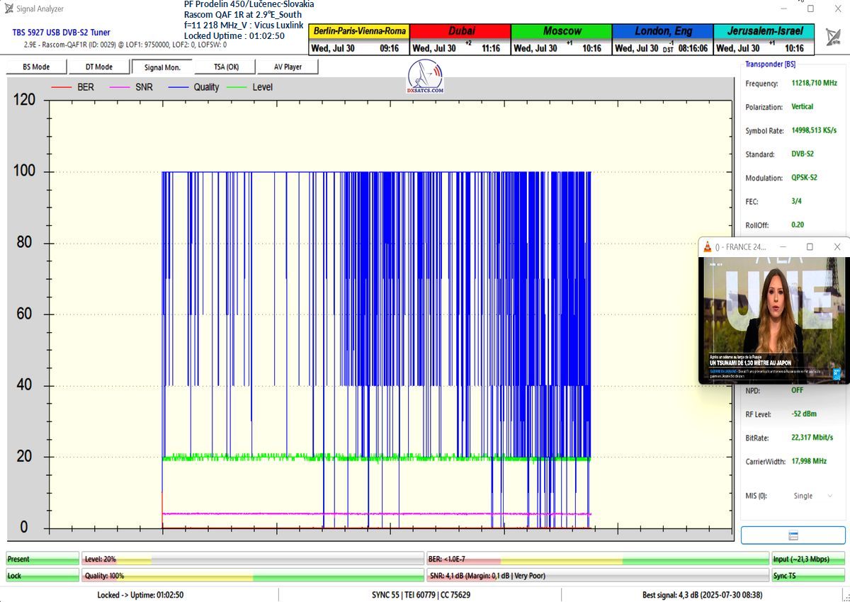Due to the minimal signal margin, where the signal quality continuously oscillated around the noise threshold at SNR = 4 dB, the primary factor degrading the visual perception was precisely the image pixelation occurring over a total duration of approximately 5 minutes. The regular drops in the blue Q-quality trace down to Q = 20% further confirm the frequent occurrence of pixelation in the image, clearly indicating that quality at those moments was fluctuating around the noise threshold.Furthermore, this signal monitoring non-evidentially confirms that only during a maximum duration of t = 23 minutes was I able to achieve uninterrupted lock reception. I cannot and will not quantify the percentage-based reception stability under the lock condition described as: “Unstable lock for several hours per day (2–4 hours), assuming ideal weather conditions with a clear sky,” because such quantification would not be objective, as the signal monitoring was not performed over a sufficiently  long period. Moreover, in this case, it concerns only experimental/limit reception at the boundary of technical feasibility using a 450 cm dish in Central Europe. I perceive this reception rather as a technical curiosity, limited to several hours per day – and even then, only under clear-sky conditions.