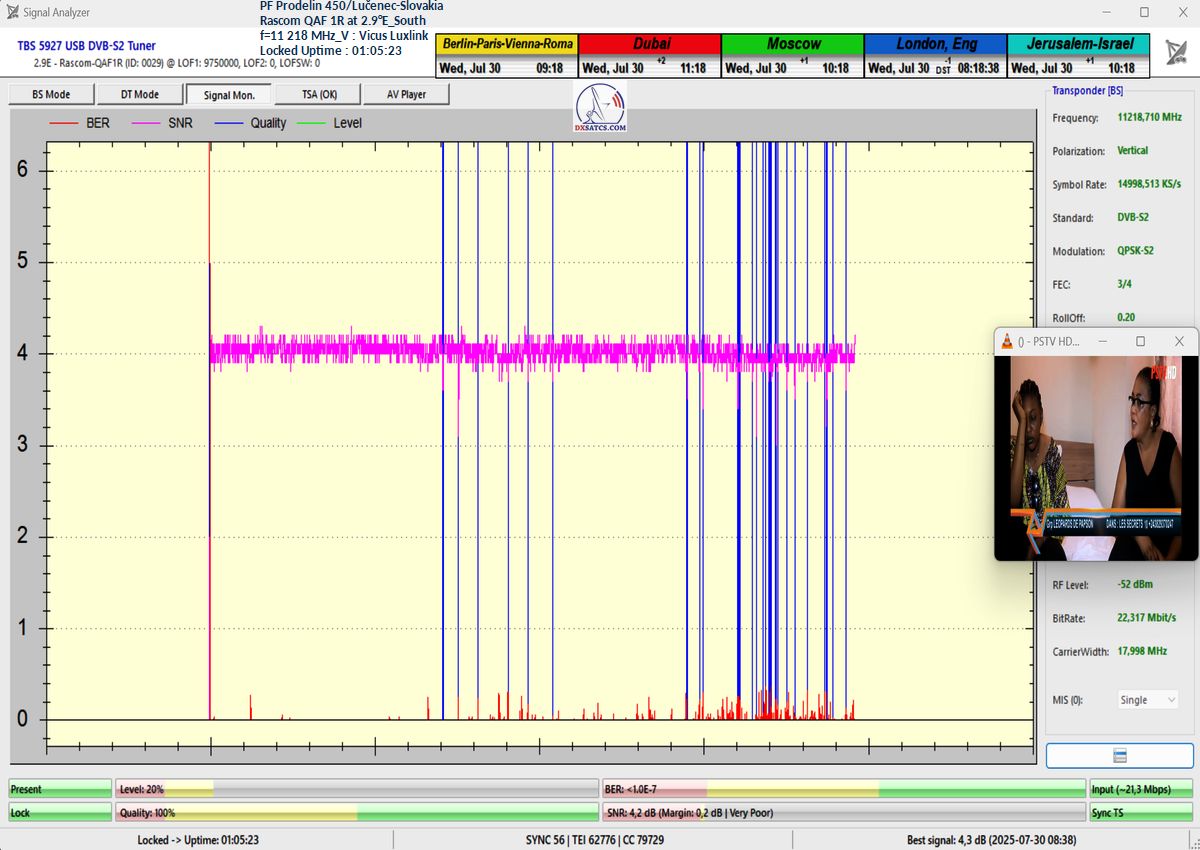 ENG:This is the first historical analysis of the spectrum and carrier quality at the frequency f = 11,218 MHz (vertical polarization) from the satellite Rascom QAF 1R at 2.9°E, concentrated within the coverage area of the radiation pattern Southern Africa (SOUTH), which I performed yesterday and this morning around 9:00 AM, at the reception site in Lučenec, in the southern part of central Slovakia, using a 450 cm parabolic antenna.In terms of achieved quality, it is an unstable form of carrier lock, with a minimal and continuously oscillating margin ranging from 0 to 2.5 dB above the noise threshold, at a minimum required C/N ratio of 4 dB for carrier locking.The following graph best represents the reception quality achieved. I further verify this state through online video samples with a minimal number of signal lock interruptions – typically lasting only one to two seconds over a two-minute recording. Judge for yourself.Moreover, these analyses were recorded under overcast skies before and after rainfall, i.e., not under ideal clear-sky conditions.Classification of the carrier lock form: this is not a random lock I have waited months for, but a daily occurrence of possible reception lasting several hours, with a minimal margin, over the past four days.