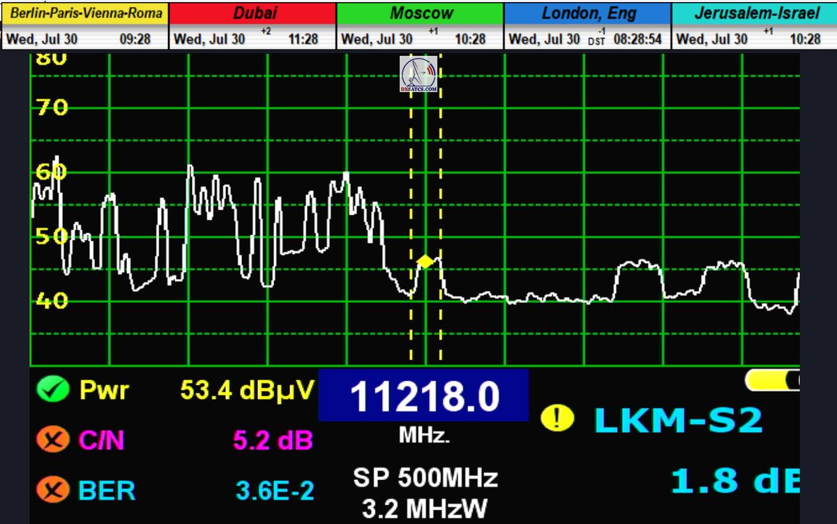 DE_Dies ist die erste historische Analyse des Spektrums und der Trägerqualität auf der Frequenz f = 11.218 MHz (vertikale Polarisation) vom Satelliten Rascom QAF 1R auf der Position 2,9° Ost, konzentriert auf den Abdeckungsbereich des Abstrahldiagramms Südafrika (SOUTH), die ich gestern und heute Morgen gegen 9:00 Uhr  am Empfangsort Lučenec im Süden der Mittelslowakei mit einer Parabolantenne mit 450 cm Durchmesser durchgeführt habe.Hinsichtlich der erreichten Qualität handelt es sich um eine instabile Form des Träger-Locks mit einer minimalen und dauerhaft oszillierenden Reserve von 0 bis 2,5 dB oberhalb der Rauschschwelle, bei einem minimal erforderlichen C/N-Abstand von 4 dB für den Lock.Das folgende Diagramm stellt die erreichte Empfangsqualität am besten dar. Ich verifiziere diesen Zustand zusätzlich durch Online-Videoaufnahmen mit einer minimalen Anzahl von Signal-Lock-Aussetzern – typischerweise nur ein