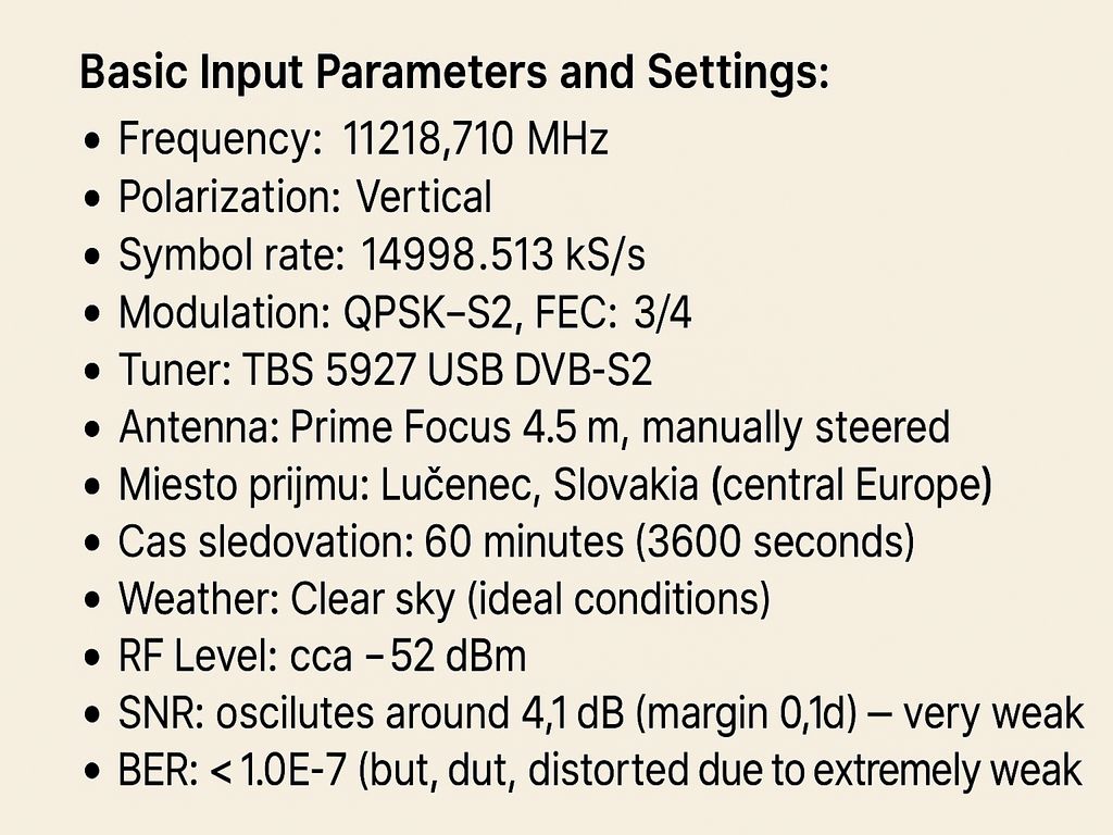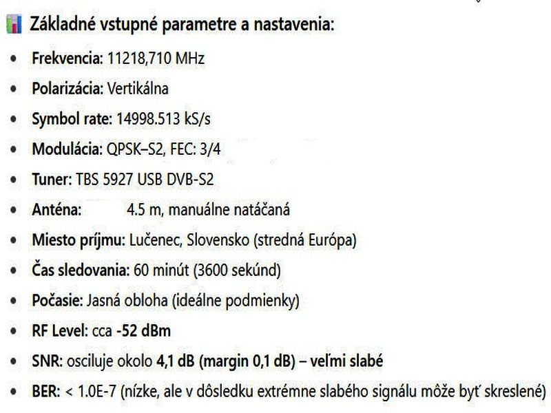 poveternostných podmienok pri jasnej oblohe“, pretože by to nebolo objektívne, keďže nejde o signálny monitoring s dostatočnou dĺžkou. Navyše ide v tomto prípade len o experimentálny/limitný príjem na hranici technických možností s parabolou 450 cm v strednej Európe, pričom jeho formu vnímam skôr ako technickú zaujímavosť, ohraničenú výskytom v jednotkách hodín denne – a aj to len pri jasnej oblohe.