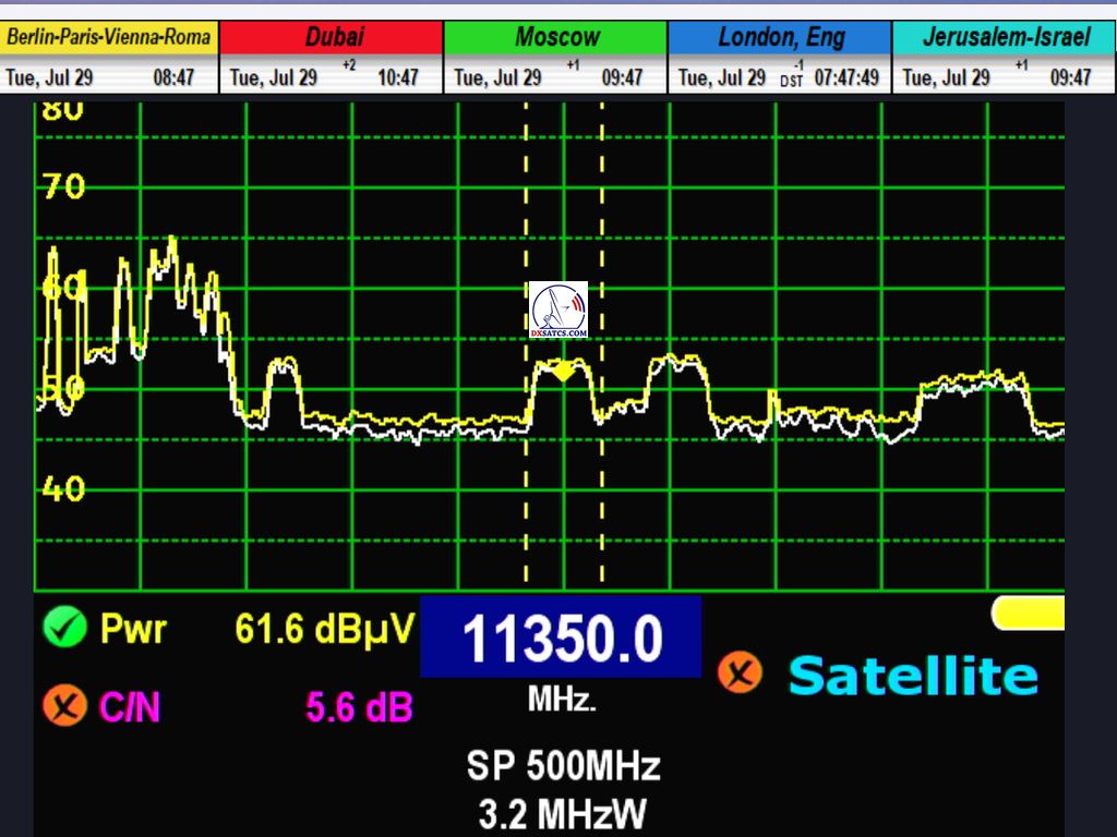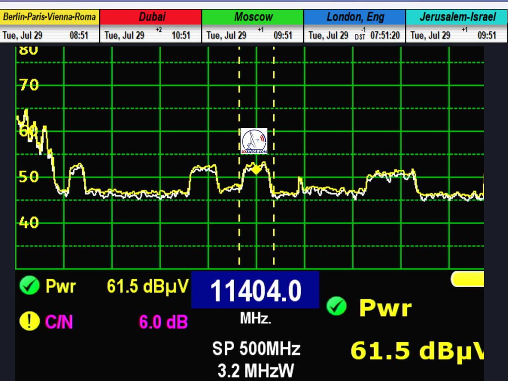 výskyt a prítomnosť dvoch nosných frekvencií — 11349 MHz a 11403 MHz — aj v geografickej oblasti strednej Európy (konkrétne v lokalite Lučenec, Slovensko), a to napriek tomu, že dané frekvencie sú podľa oficiálneho vyžarovacieho diagramu určené pre oblasť južnej Afriky. Po úspešnej spektrálnej identifikácii nosných frekvencií pristúpim k meraniam signálových parametrov, predovšetkým odstupu nosnej zložky od šumu (C/N),