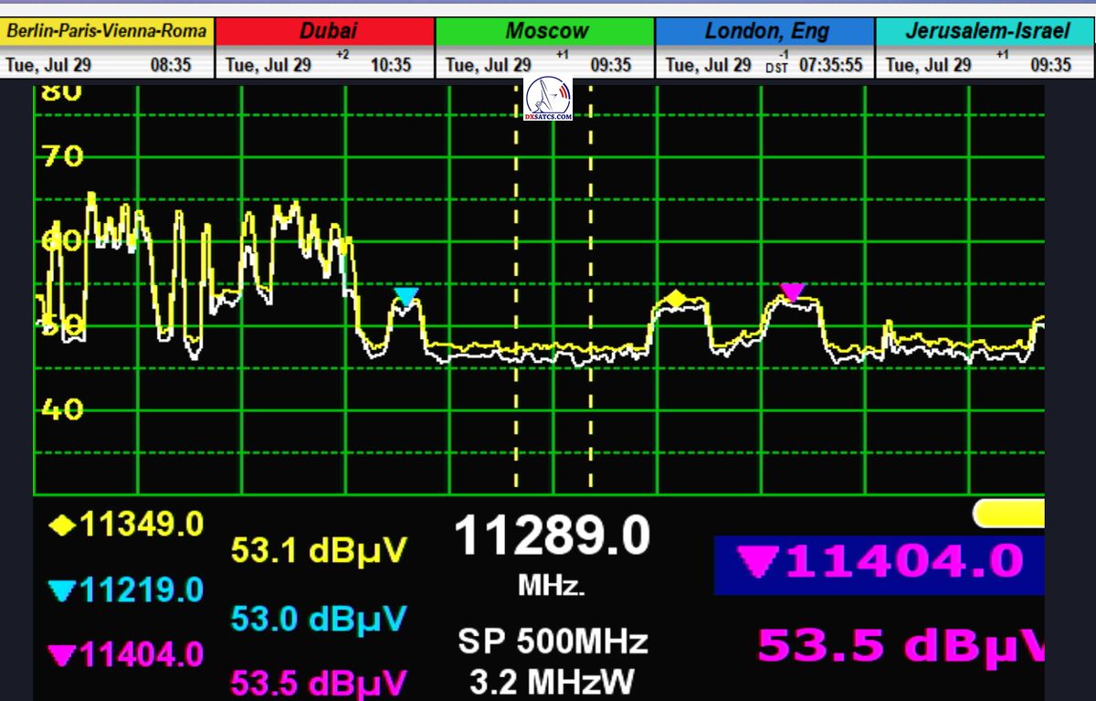 verify the presence of two carrier frequencies — 11349 MHz and 11403 MHz — in the geographical region of Central Europe (specifically Lučenec, Slovakia), despite the fact that these frequencies are officially intended for the South African footprint of the satellite beam.Upon successful spectral identification of the