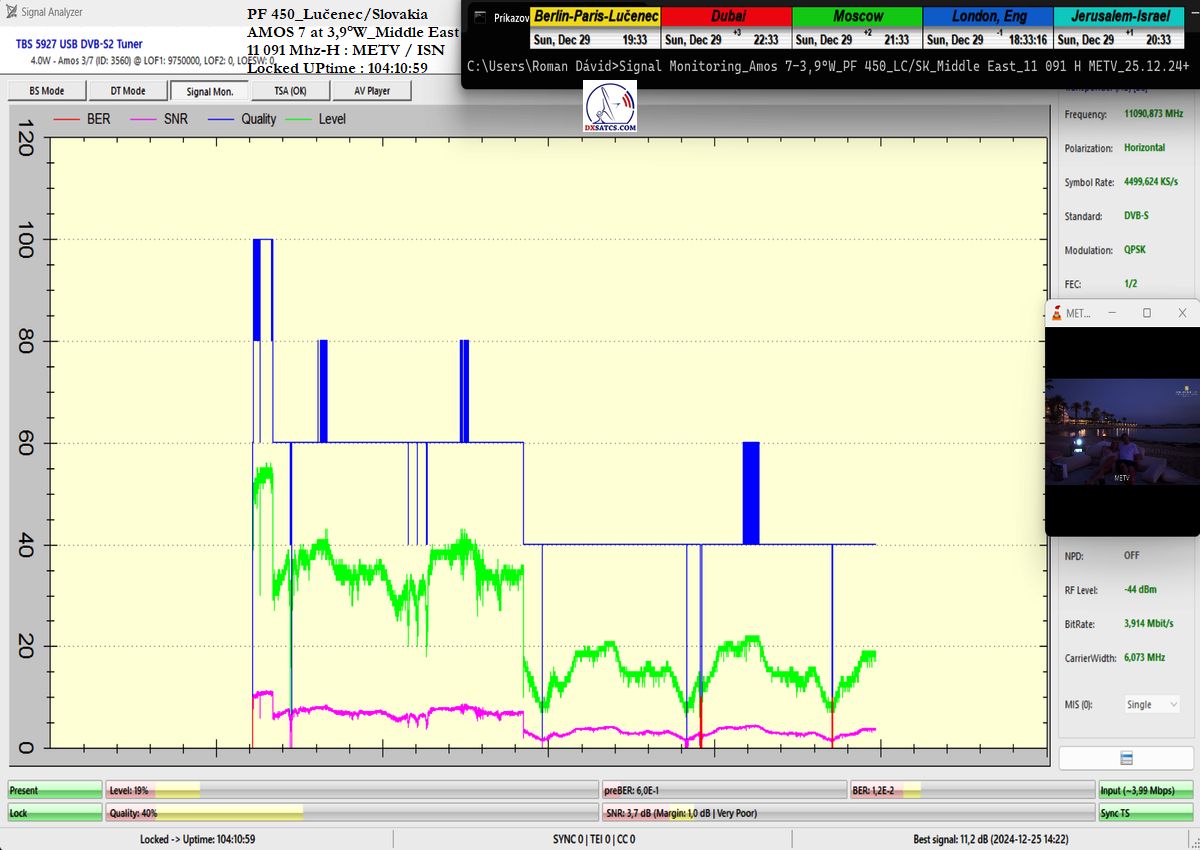 In the overall monitoring period 0>6 from approximately 11:26 CET on December 25, 2024, to approximately 19:37 CET on December 29, 2024, I achieved a total reception stability expressed as a percentage of exactly: 99.34452% in the signal monitoring unit t=104 hours and 15 minutes. In other words, out of the total 104 hours and 15 minutes, I achieved full reception stability for METV at f=11,091 MHz_H without a single pixelation or outage for 103 hours and 34 minutes, which, critically speaking, is an acceptable result.