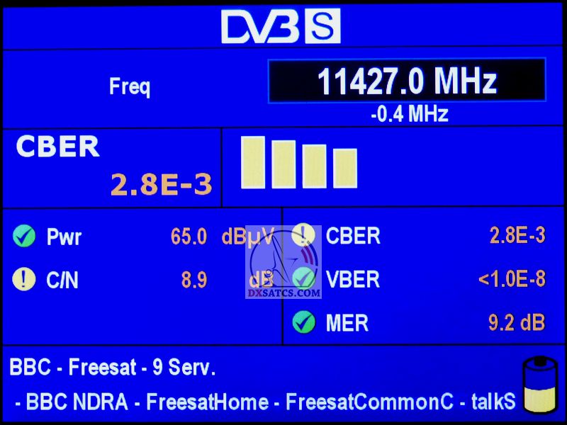 ,pri polojasnej oblohe,úrovne MER=8,8 dB (Televes H60) alebo SNR=9,7 dB pri DVB-S2 tunere AVL 6222_VU+DUO .