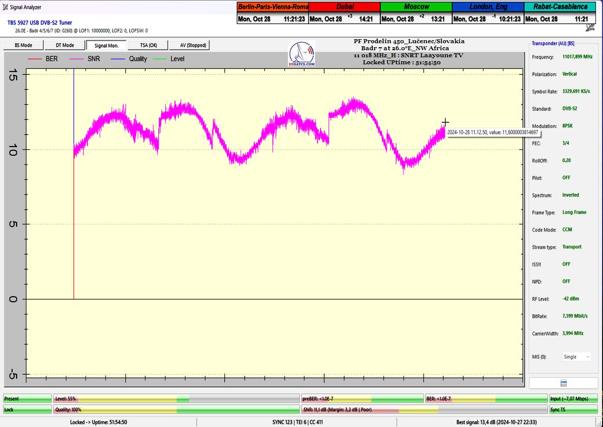 EN_Classification of achieved results at f=10,986 MHz: With the help of my original technological invention, named "Synchronous Nanocorrections," I indisputably achieved a stable carrier lock at 100% in a monitoring period of t=76 hours, without a single continuity dropout in its function. Depending on weather  conditions and the SMW-brand LNB used, peak quality ranged from 13.6 dB (at t=76 hours and LOF=10 GHz) to 14.2 dB_SNR (at t=21 hours and LOF=9.75 GHz).