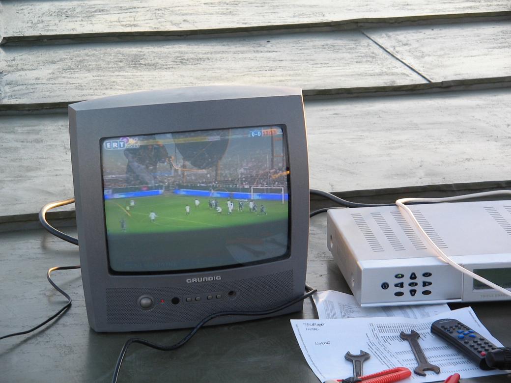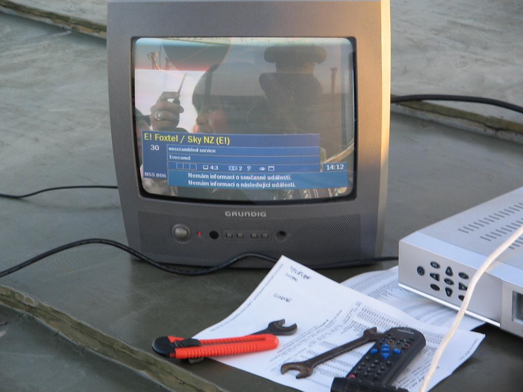 Za poměrně větrného, studeného počasí pozdě odpoledne, bez cizí pomoci najít zmíněný satelit NSS806 netrvalo snad ani  dvacet minut.  Bohužel nastupující šero mě nedovolilo zkusit vyhledat PAS9 na 58 st. západně. Vrátil jsem se k jistotě a naladil EXPRES 6A na 80 st. východně. Tady naběhly všechny programy na maximum během chvilky.  Byl jsem mile překvapen funkcí zmíněné depolarizační destičky. Tam byl asi základní problém. Na Humax 5500 bylo vyhledání satelitu velmi obtížné (neřku-li nemožné), na Tripldragona celkem bez problémů (při vložení prakticky jakékoliv frekvence z přijímaného satelitu). Když pominu nejprve černobílý obraz NTSC (výměna kabelu scart za jiný s obsazenými všemi kolíky a pohoda), pak zase výběr polarizační destičky z různého materiálu - neosvědčil se teflon, ale materiál z cuprextitové desky udělal divy. Pokud by ještě počasí dovolilo, zkusil bych možná ještě nějaký exotický satelit. Přiložené fotografie jsou dělané na rychlo, jen pro "jakous takous" dokumentaci, proto omluvte jejich kvalitu.