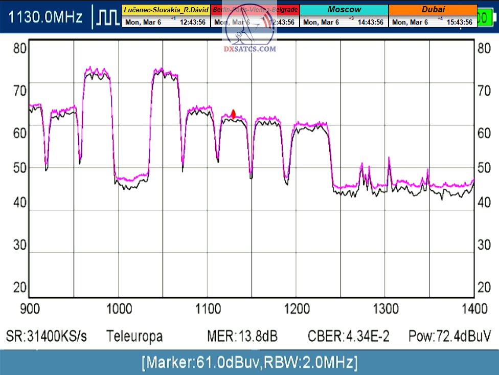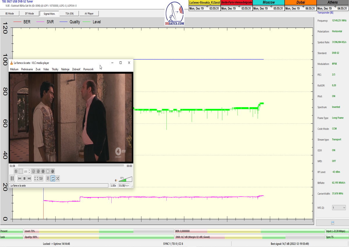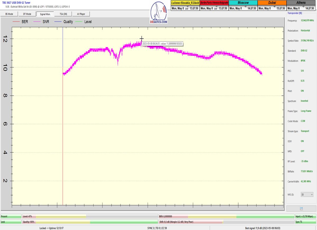 ►8.2.2023 : Na príklade dokazovania v signálnom monitoringu v dĺžke 1x73 hodín dnes nespochybniteľne dokážem začlenenie frekvencie f=12 188 MHz_V do DTH kategorizácie štandardnej formy konštantne stabilného satelitného príjmu (99,999%) s doteraz najvyššou špičkou kvality okolo SNR=15,8 dB ktorá sa opakuje každý deň.Z technologickej stránky je príjem z TP IT3 výnimočný hlavne tým že veľkosť uhlovej odchýlky SKEW ostáva konštantná aj pri výrazných zmenách v poveternostných podmienkach.Ďalej dnes dokážem plnú stabilitu príjmu v štandarde DVBS2-16APSK-Multistream aj pri intenzívnom snežení dňa 27.1.2023 so stabilnou výškou kvality okolo SNR=14,3 dB atď