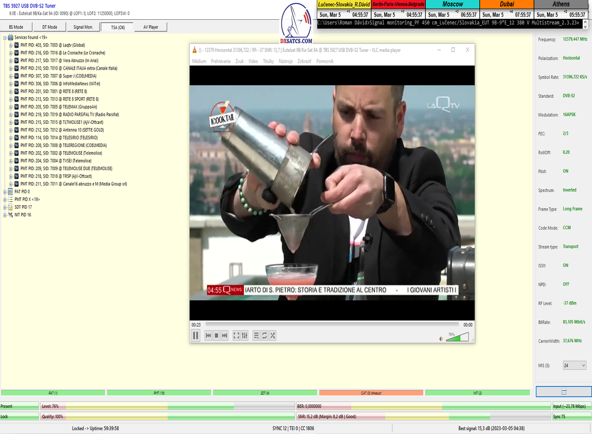 s verifikáciou stredoeurópskeho času v TV vysielaní,napríklad v SKY TG24,pretože to je dôkazom o reálnosti signálnej kvality,ktorú som v meste Lučenec dosiahol.Ak by niekto spochybňoval hladiny SNR zo samotného SW EBSpro,potom na dôkaz vyvrátenia týchto pochybností ponúkam ďalšie 3 signálne zdroje ako napríklad analyzátor Metek HD,4K receiver Octagon,SW CrazyScan a pochybnosti všetkého druhu sú razom blízke alebo rovné NULE. Ospravedlňujem sa za môj slovník určený pre publikum s určitou mierou "mentálnej invalidity alebo mentálneho postihnutia",ale občas je vhodné zopakovať si aj elementárnu abecedu,pretože nie každý čitateľ pochádza z odbornej alebo vedeckej sféry a moje vysvetlenie smerujem aj do radov takzvaných