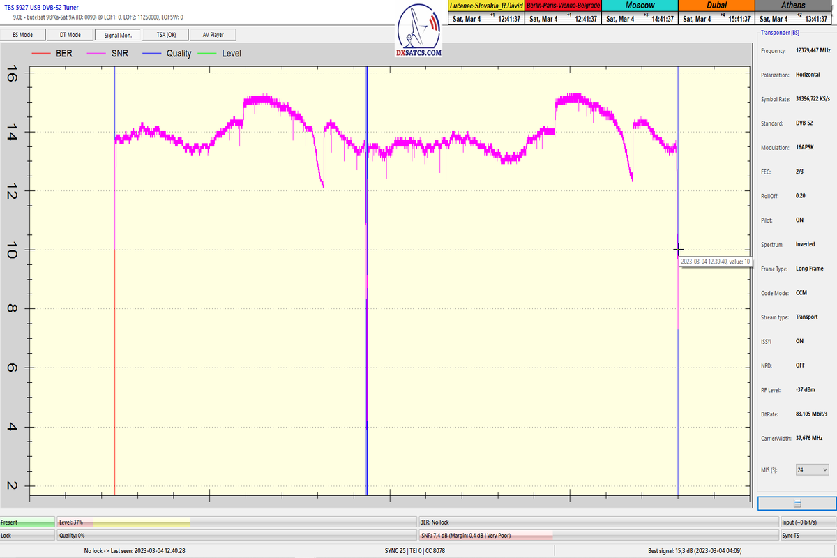►Priebežné stavy v signálnom monitoringu na f=12 341 MHz_V sa dokazujú v online video ukážkach,ktoré sa nedajú spochybniť.Kedže z principiálneho hľadiska platí že "Všetko sa dá spochybniť" moje argumenty znejú nasledovne : Signál s dostatočnou kvalitou sa nedá "svojpomocne vyrobiť " a priebehy a okamžité úrovne SNR,BER,Pwr... demonštrované v online video ukážkach sa nedajú zobrazovať a ani dodatočne upravovať v OFF-LINE režime,pretože ten neexistuje.To je dôvod prečo tak zdôrazňujem slovo ONLINE video ukážka