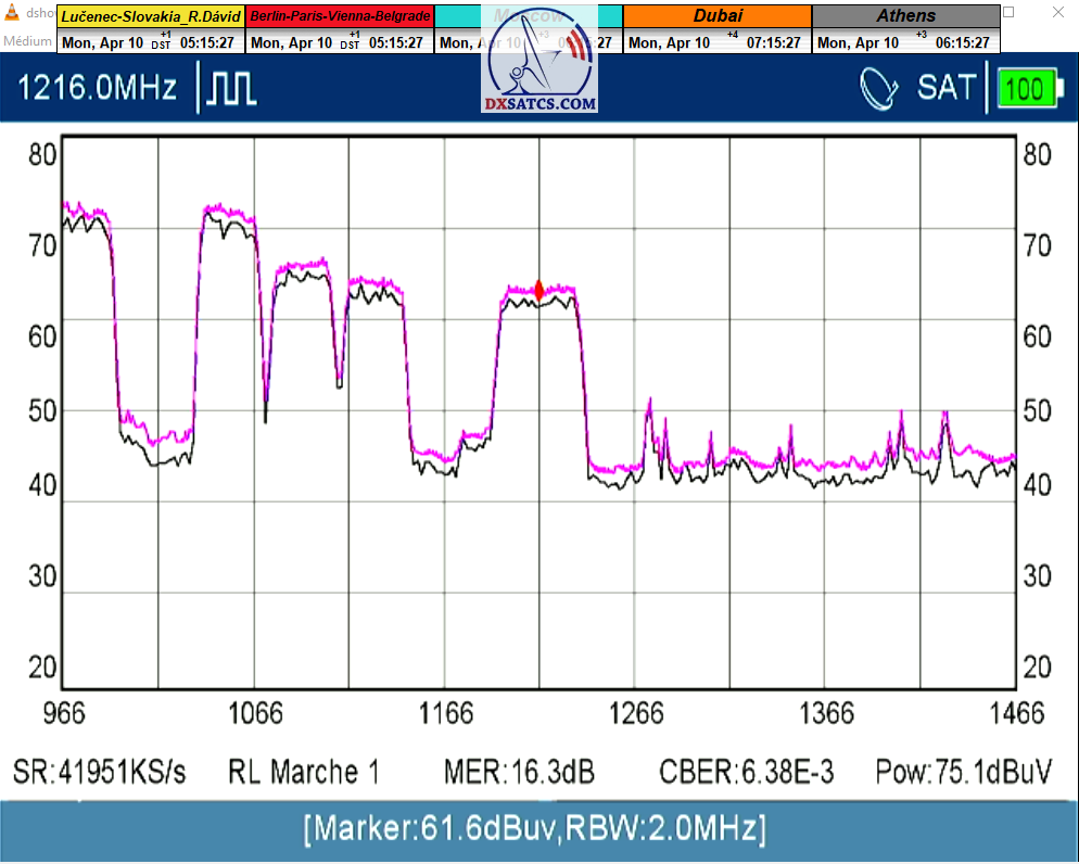 ►Špička kvality dosiahnutá v monitorovanom období od 2.4.2023 do 11.4.2023 : metodika postupu zberu dát o špičke kvality na f=12 466 MHz_V je v prípade analyzátora Metek HD a 4K receivera Octagon SF 4008 postavená na sústredení dát len v jeden konkrétny deň,konkrétne 10 a 11.4.2023, (z dôvodu aby som sa čo najviac priblížil dňu uverejnenia),nie na každodennom monitoringu a zbere dát o špičke kvality za jednotku t=9 dní, pretože potom s pravdepodobnosťou,ktorá hraničí s istotou by bola dosiahnutá špička kvality ešte vyššia.