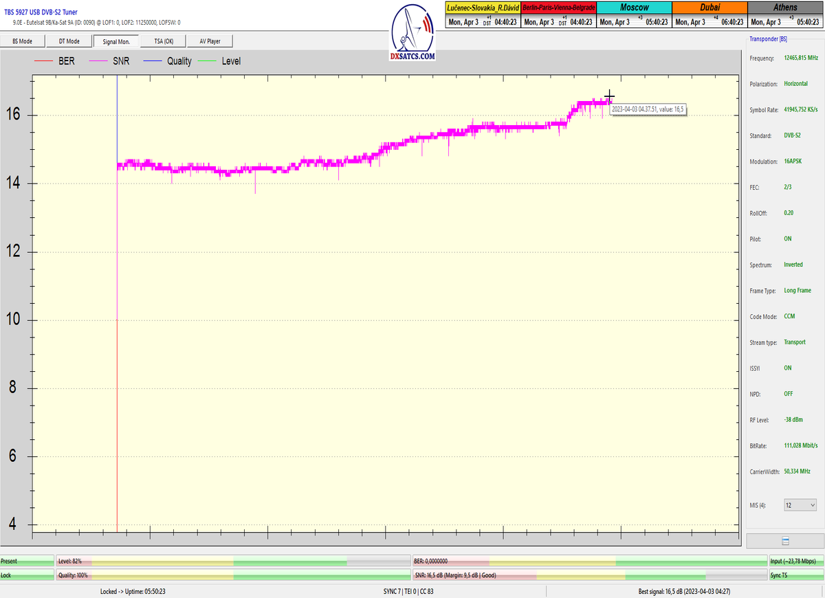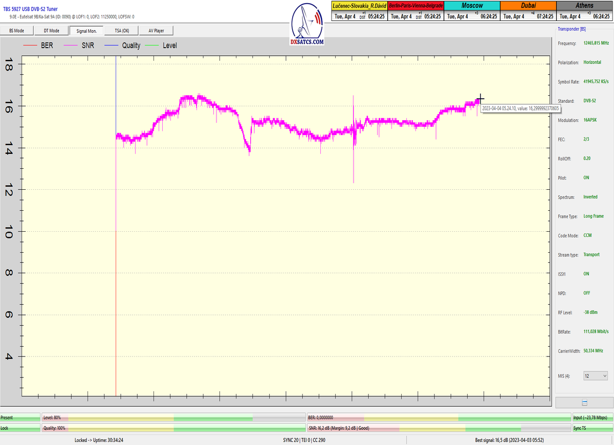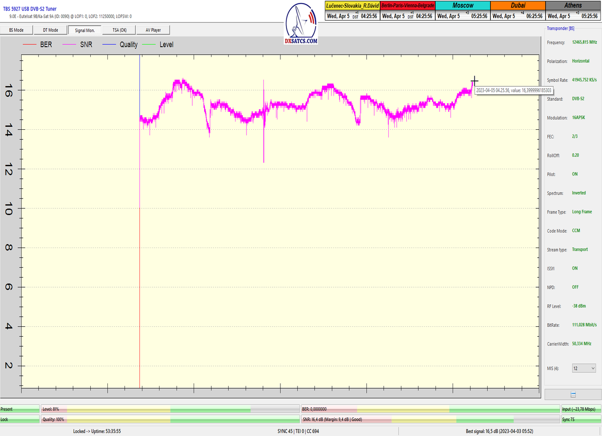 ►12.4.2023 : Eutelsat 9B-9,0°E_Italy Ku_16APSK Multistream : Dnes odpoviem aj na tieto otázky a všetky svoje tvrdenia nespochybniteľne dokážem,pretože sa nachádzame na vedecko-výskumnej pôde : Ako má vyzerať exemplárny priebeh príjmu v praxi a dá sa dokázateľne dosiahnúť stabilný príjem na 100% ? Je možné s bežným 4K receiverom Octagon na báze OS Enigma 2/OPEN ATV 7.1 dosiahnúť stabilný príjem talianskeho vysielania v norme MULTISTREAM a to dokonca celodenne a s vysokou rezervou okolo 5-6 dB ?