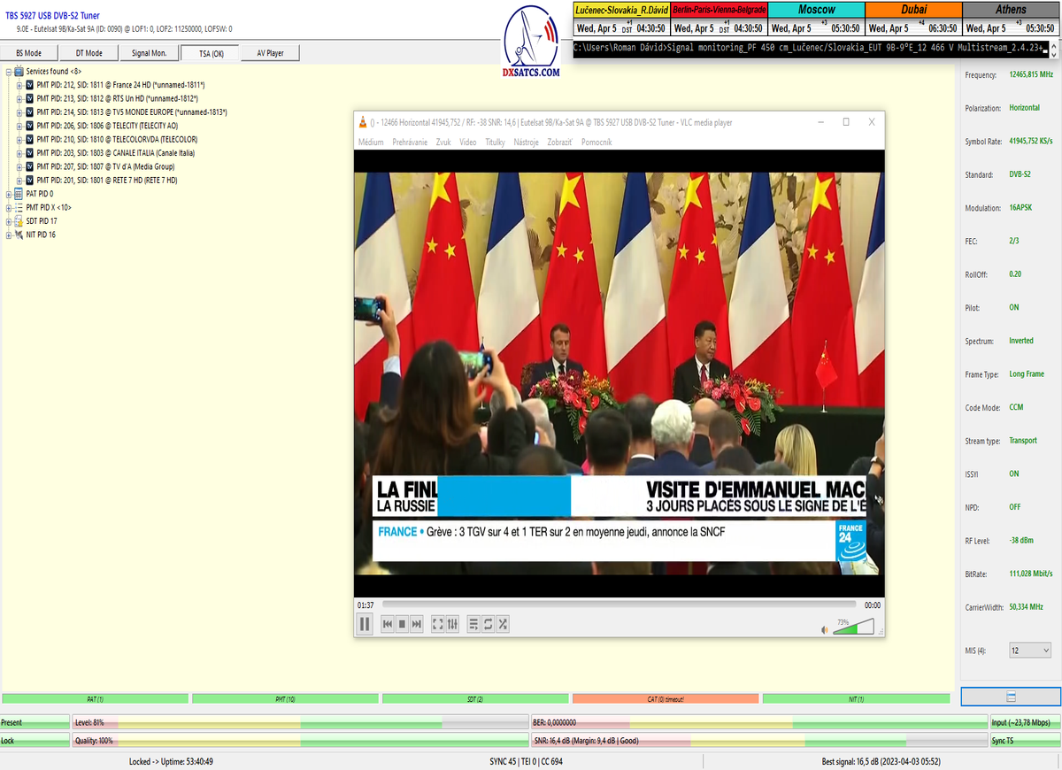 > PARAMETRE PRENOSU : DVB-S2 _ 16APSK _ SR=41 950 _ FEC=2/3 _ PLS Gold 262140 _ Multistream 12-13-17-23 <