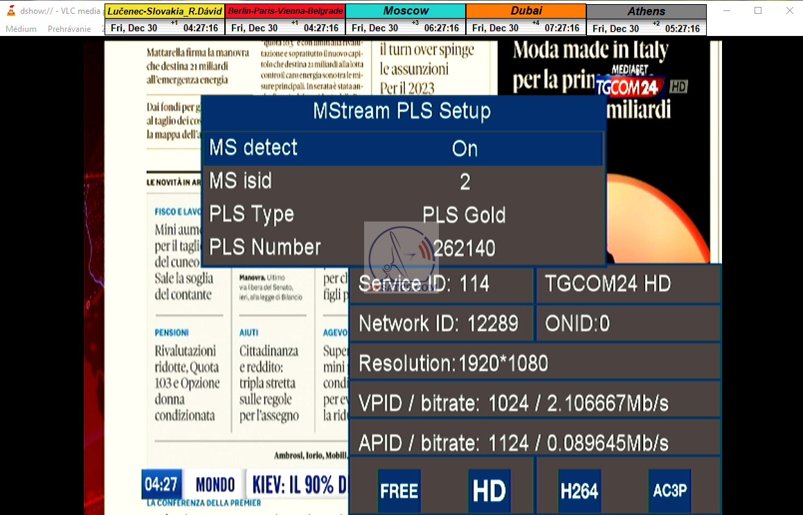 > PARAMETRE PRENOSU : DVB-S2 _ 8PSK _ SR=31 400 _ FEC=2/3 _ PLS Gold 262140 _ Multistream 1-2 <
