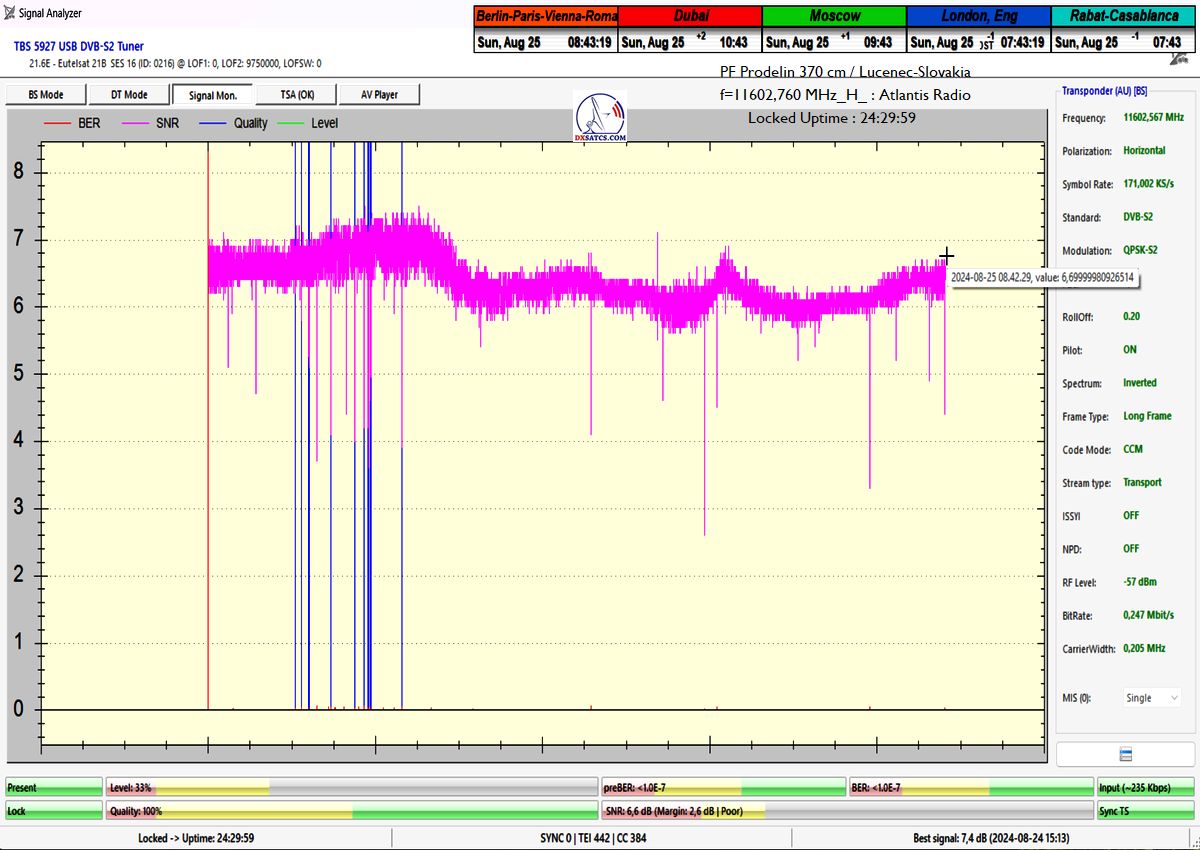 Classification of the achieved results: Despite the fact that the peak quality achieved with the applied oscillator LOF1=10.00 GHz exceeded the peak quality of LOF2=9.750 GHz by 0.7-0.8 dB, or 7.4 dB with LOF2 < 8.1 dB-8.2 dB with LOF1, I did not achieve 100% reception stability with either oscillator, and during  the 24-hour period, there were typically 8-10 dropouts in the continuity of the Lock, which I can quantify as a degraded reception stability of 99.05% with LOF1 and 99.87% with LOF2. With LOF1, I recorded a total of 4 dropouts lasting around 40 seconds each and one long dropout lasting 780 seconds, amounting to 820 seconds in total, due to the fact that the restoration of the Lock after its loss or dropout is not instantaneous and typically takes around 5 seconds at the given SR=171 ksym/s. Paradoxically, I achieved higher reception stability with LOF2=9.75 GHz than with LOF1,  despite the overall higher SNR peak quality by approximately 0.7-0.8 dB with LOF1=10.00 GHz.  You may ask how a dropout in the continuity of the Lock is visualized on the signal monitoring graph? The answer: When the blue quality curve (which drops to 0%) and the red BER error rate curve merge on the X-axis, an immediate dropout in the continuity of the Lock occurs,  meaning the radio stream data flow freezes. Temporary drops in the blue quality curve (Q) in percentages, for example to levels of 40% or 20%, also have an impact on the smoothness of the data/stream flow, but do not cause a dropout in continuity. This is known as the threshold or limit state of reception with minimal signal reserve in the signal chain.