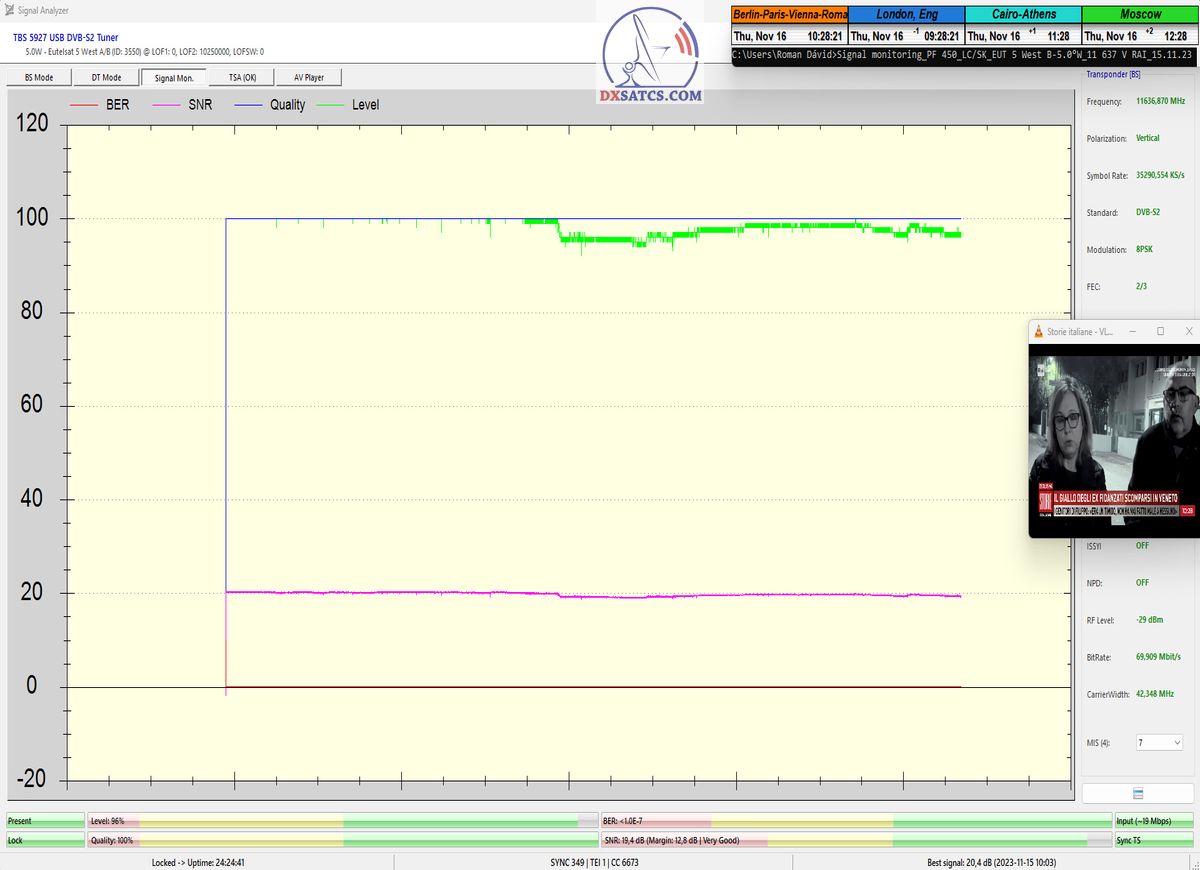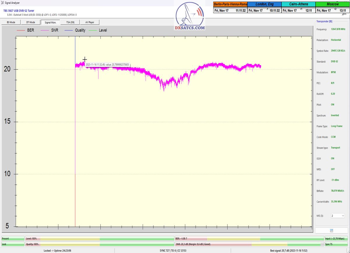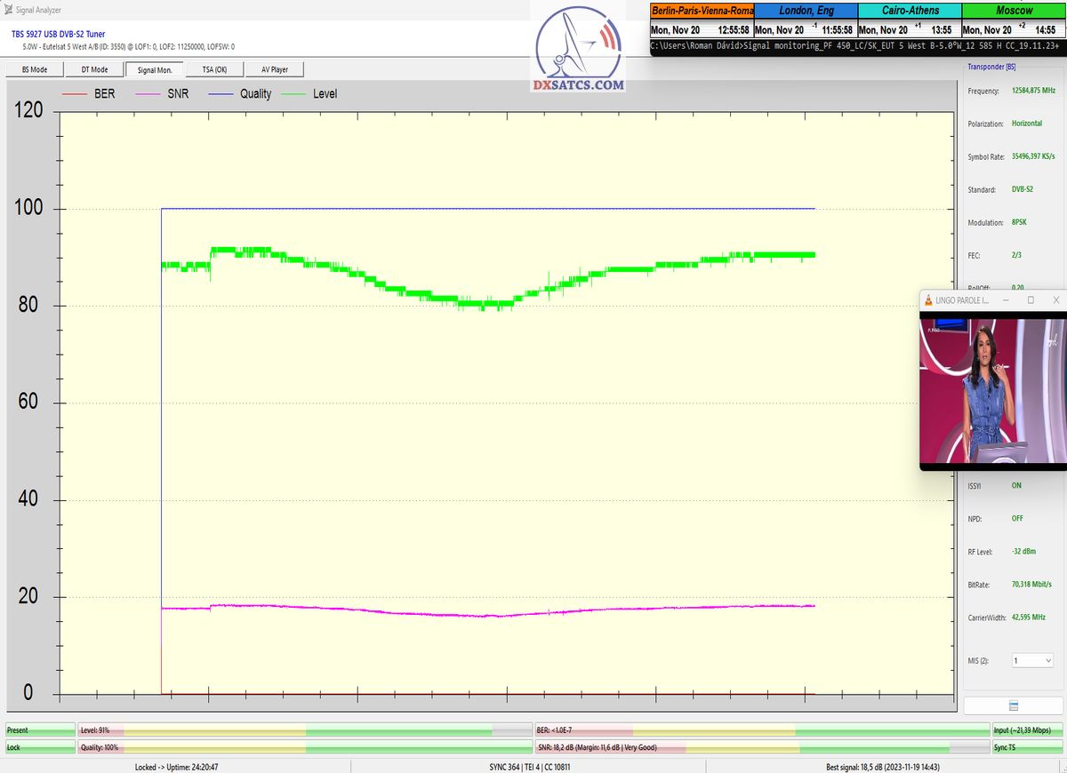 ►29.11.2023 : Based on the example of proving through signal monitoring of Rai and Canal+ packets broadcast in the DVB-S2/Multistream technological standard from the Eutelsat 5 West B satellite at 5.0°W, today I can demonstrate to you that I have effectively and, above all, stably transformed the relatively high intensity of the emitted EIRP power into the resulting quality which I quantify by the signal-to-noise ratio SNR=20>21+ dB_with the used configuration of modulation parameters of the signal path DVB-S2/8PSK/FEC=2/3.Today, I will demonstrate the effectiveness with which I have managed to minimize the mutual spectral penetration or interference of the waves from the V to the H quadrant and vice versa and how it relates to the resulting reception quality. I will perform a spectrum analysis with a frequency span of only 200 kHz, visualizing the presence of two frequencies with TT&C signals etc.