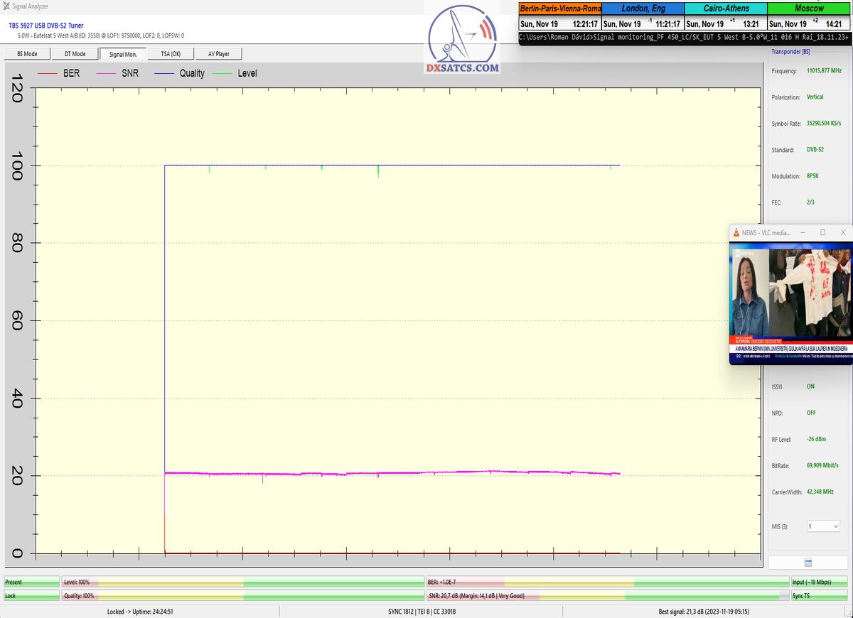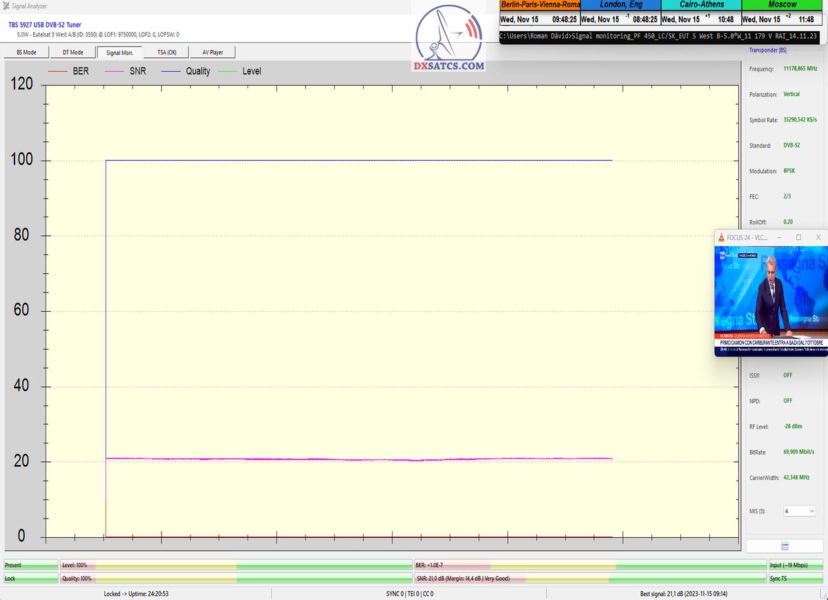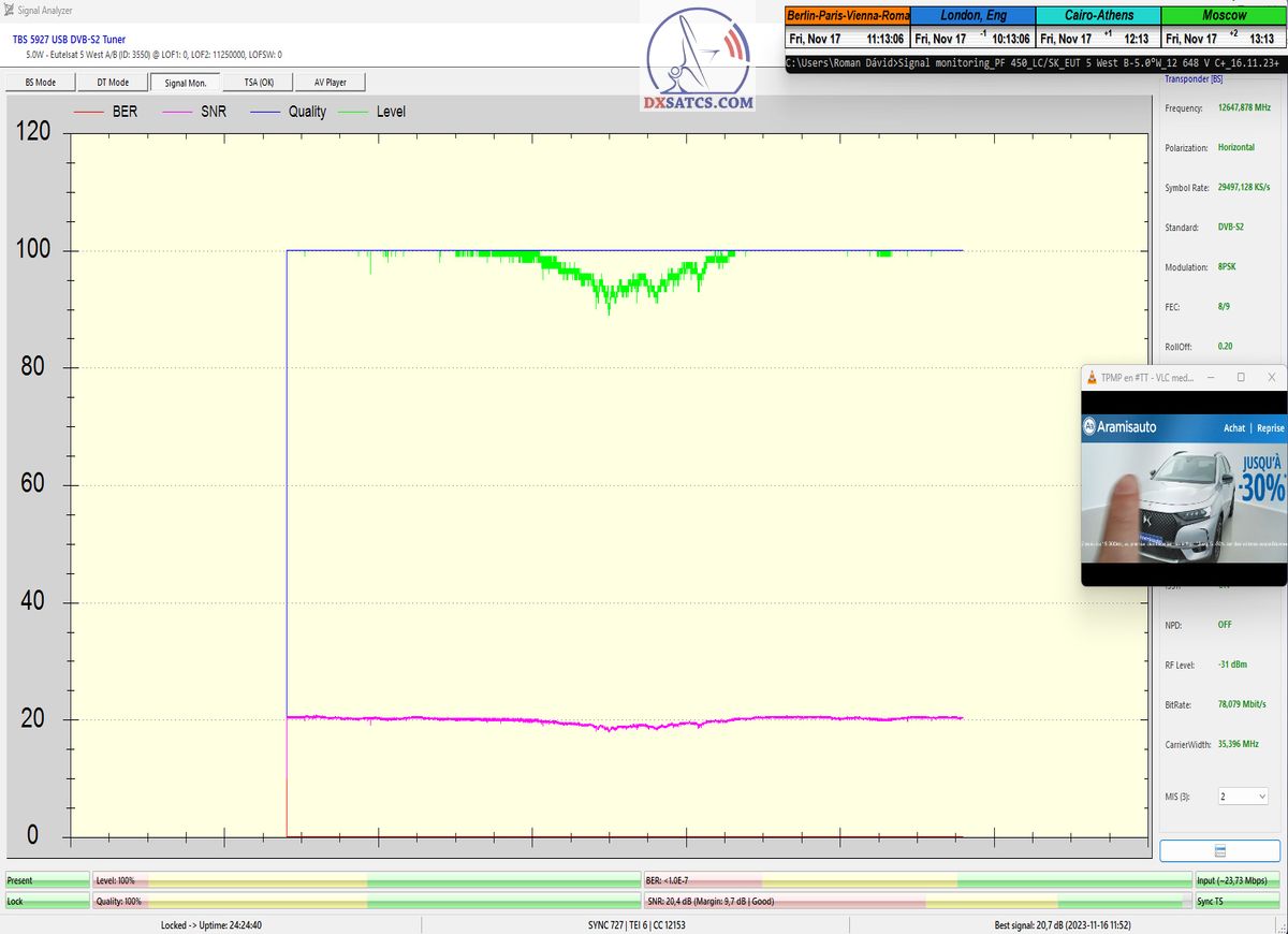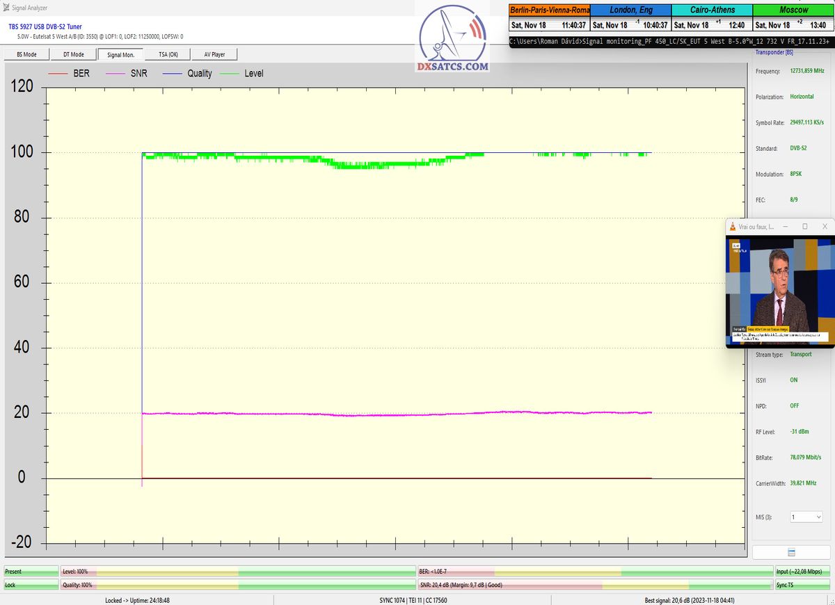 ►29.11.2023 : Based on the example of proving through signal monitoring of Rai and Canal+ packets broadcast in the DVB-S2/Multistream technological standard from the Eutelsat 5 West B satellite at 5.0°W, today I can demonstrate to you that I have effectively and, above all, stably transformed the relatively high intensity of the emitted EIRP power into the resulting quality which I quantify by the signal-to-noise ratio SNR=20>21+ dB_with the used configuration of modulation parameters of the signal path DVB-S2/8PSK/FEC=2/3.Today, I will demonstrate the effectiveness with which I have managed to minimize the mutual spectral penetration or interference of the waves from the V to the H quadrant and vice versa and how it relates to the resulting reception quality. I will perform a spectrum analysis with a frequency span of only 200 kHz, visualizing the presence of two frequencies with TT&C signals etc.