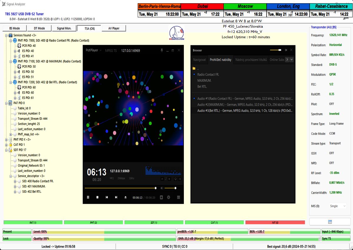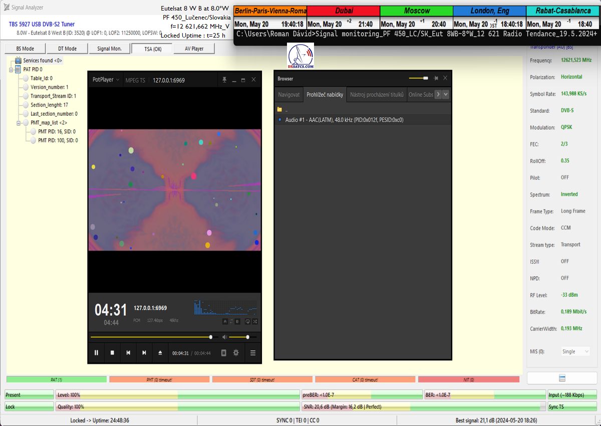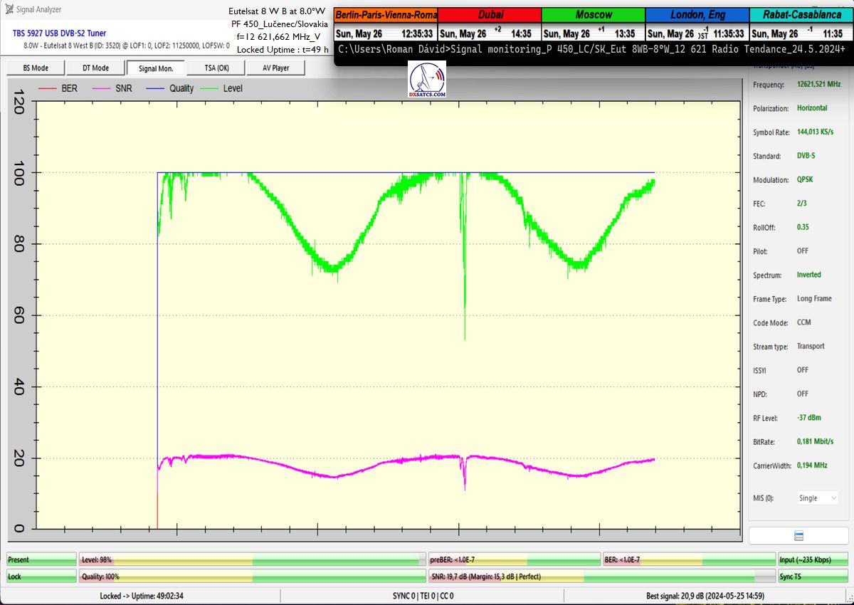 ►Eng_Classification of achieved results at f=12 621,662 MHz: The methodological procedure I have proposed for measurements and the presentation of indisputable results verifies, through visualized demonstration, the state of achieving stable reception at 100% within a monitoring unit of t=49 hours on the SCPC carrier of Tendance Ouest radio,with an applied symbol rate (SR) of 144 ksym/s.The quality peak currently and at the end of May oscillates significantly from approximately 14 to 21 dB in the Signal-to-Noise Ratio (SNR) unit, and during heavy rainstorms, it significantly drops to 10.5 dB, with a sufficiently high instantaneous reserve of around 5 dB. The typical height of the signal reserve under standard and significantly unimpeded weather conditions oscillates in the range of 9 to 16.5 dB. Processing radio carriers with higher symbol rates than SR>200 ksym/s is not considered technologically challenging or unconventional (from the perspective of achieving LOCK continuity) and in conditions with provider-guaranteed high power intensity (EIRP=53 dBW) in the European radiation diagram of the Eutelsat 8 West B satellite, I do not need to and will not demonstrate their reception stability. I have only chosen a minimum verification unit of t=60 minutes to avoid presenting "worthless" second-long LOCKs from the frequency spectrum.