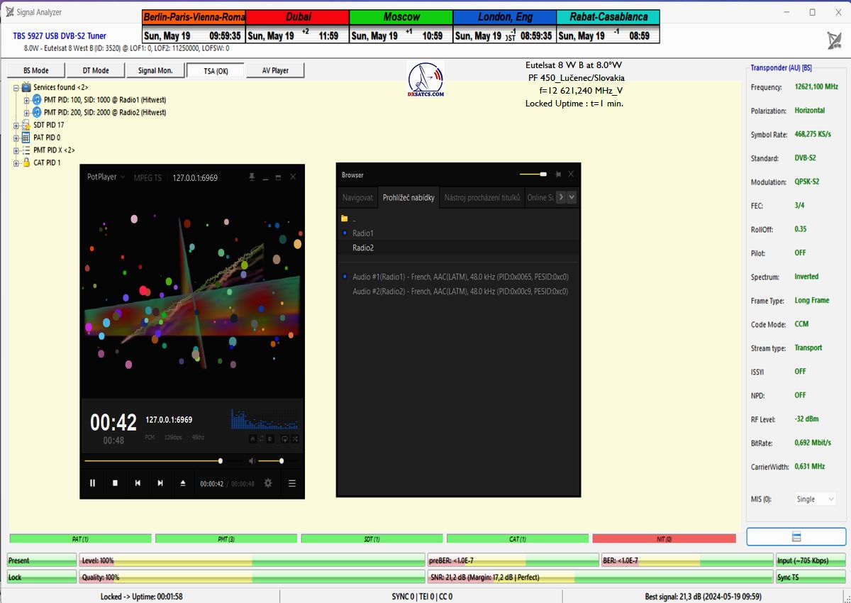 SNR= 20,6 dB (DVB-S_QPSK_1/2)                       SNR= 20,3-21,3 dB   (DVB-S2_QPSK_3/4)