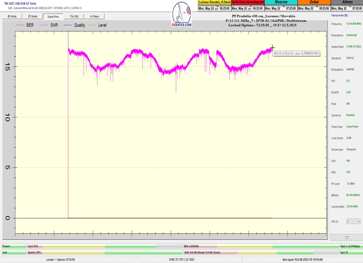 od približne 03:00 do 11:00 CET kvalita príjmu neklesne ani o 0,1 dB_SNR aj napriek tomu že  veľkosť uhlovej odchýlke SKEW/LNB zmením až o 4°