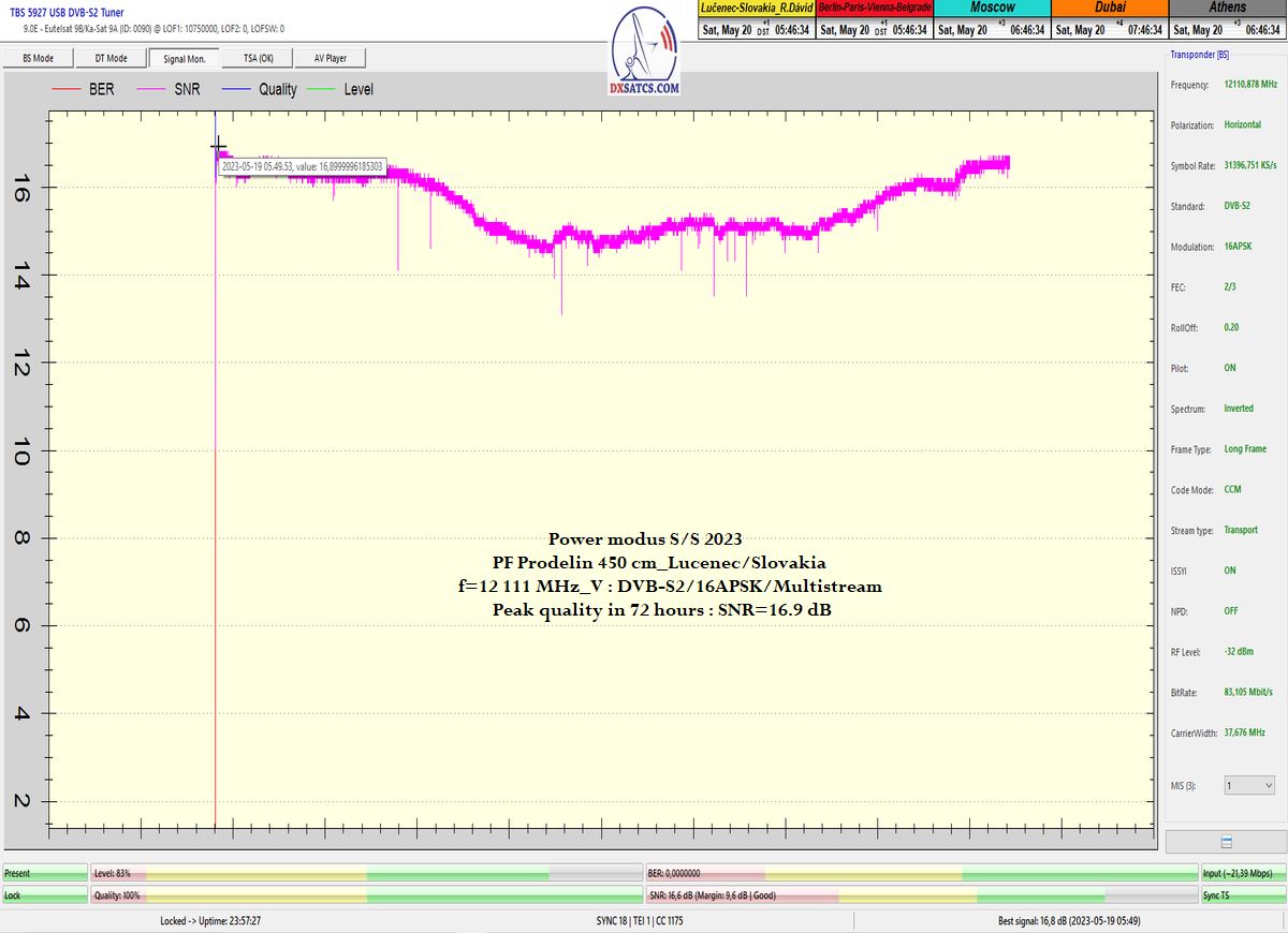 Jednotka SNR _ TBS 5927 & špička kvality za 72 hodín : 15,5 dB  < 16,8 dB  (1x16,9 dB)