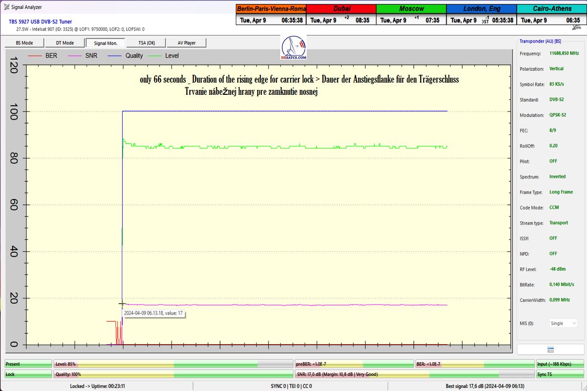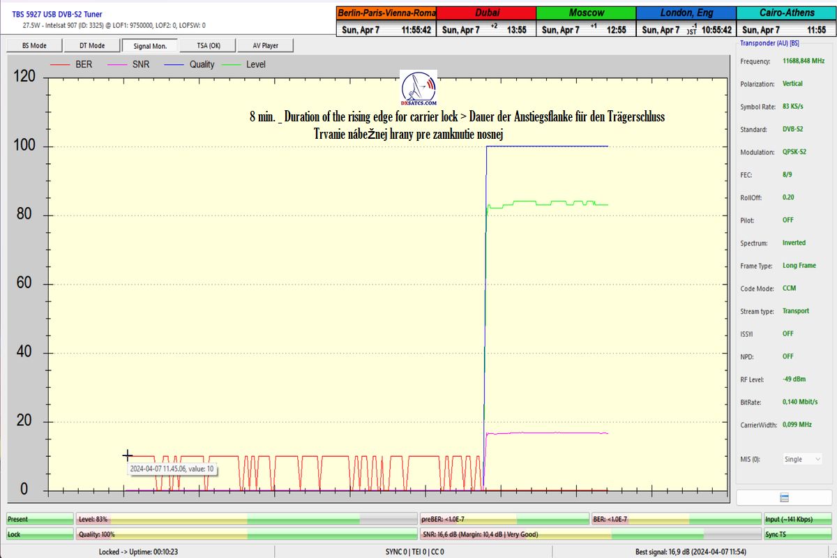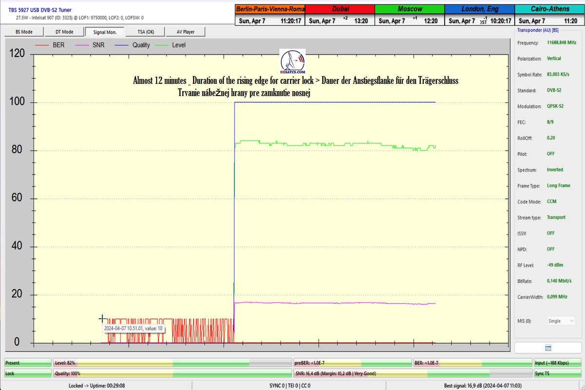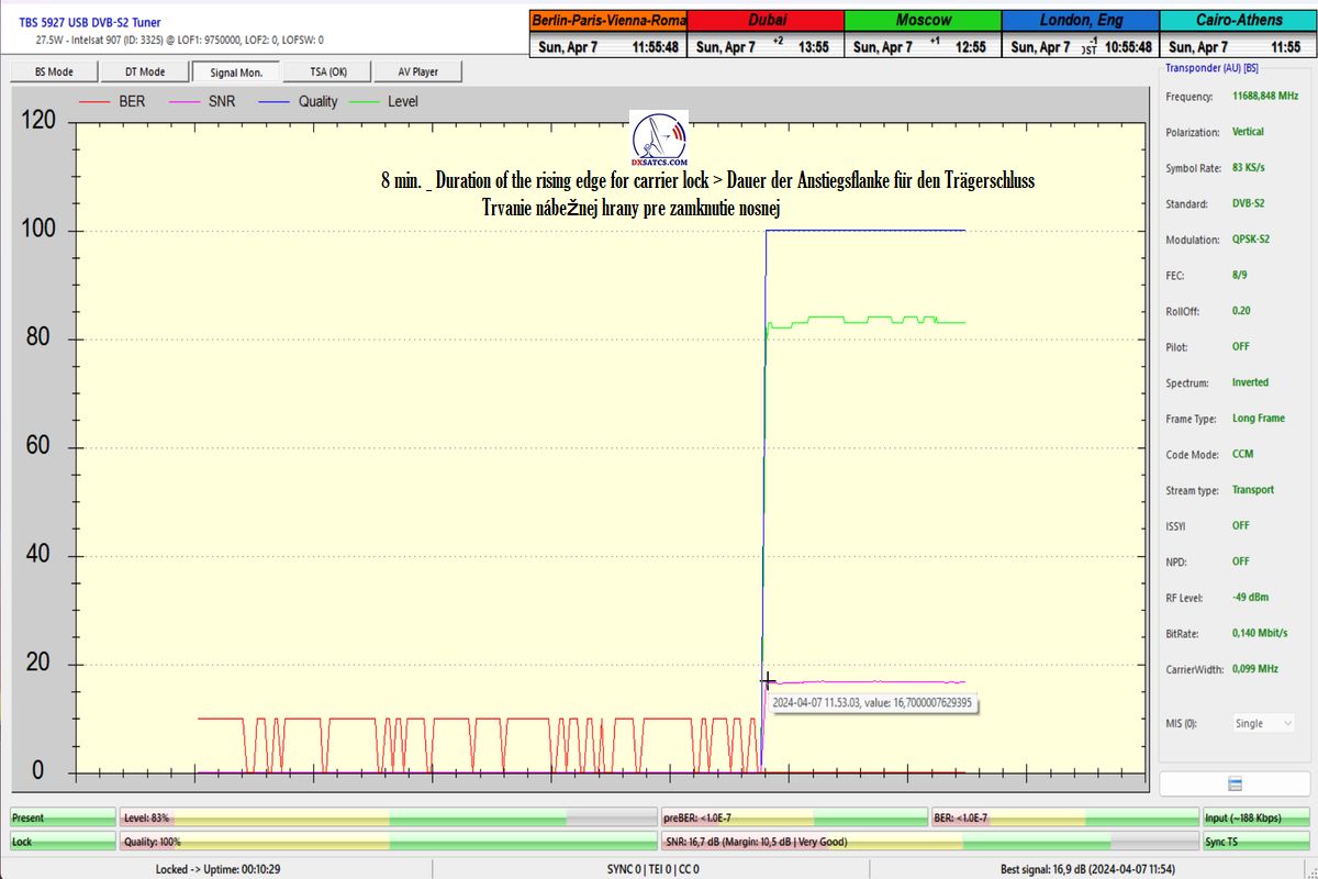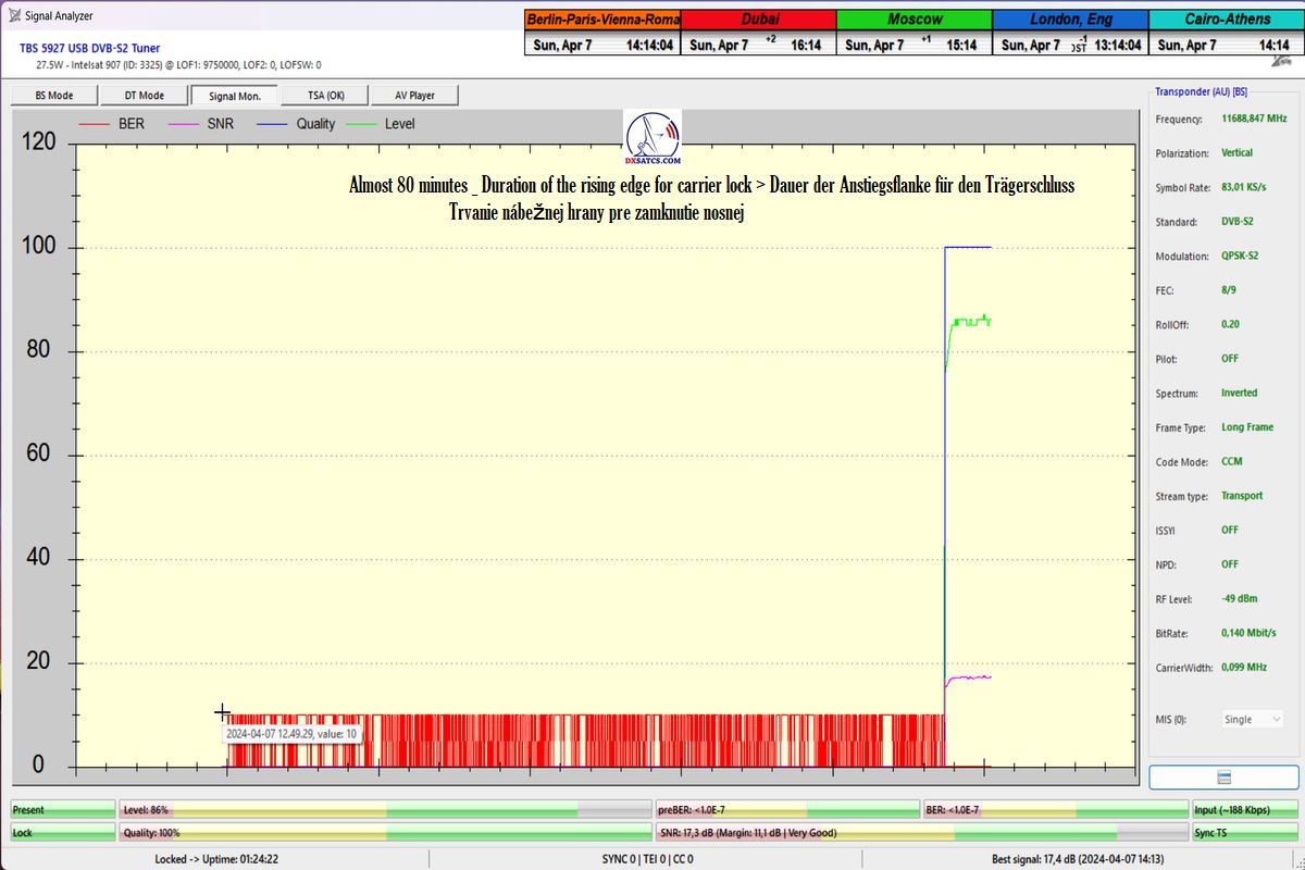German:Die erste Fallstudie in Europa von Autor Roman Dávid aus Lučenec,in der in der Verifikationseinheit des Monitorings bei t=77 Stunden zweifelsfrei beweist,dass die HW/SW-Konfiguration der PC-Karte TBS 5927 und des Programms EBSpro auch bei den niedrigsten Symbolraten (SR),konkret SR=83 ksym/s,