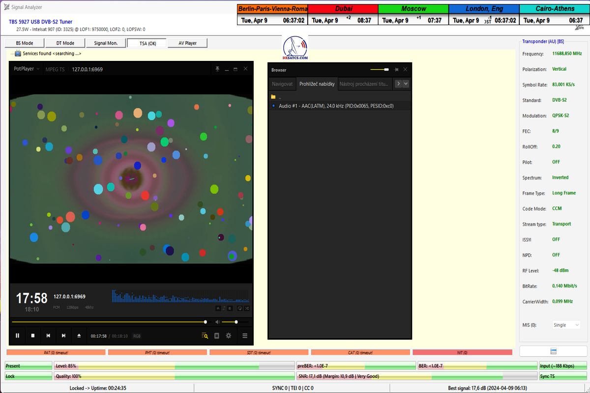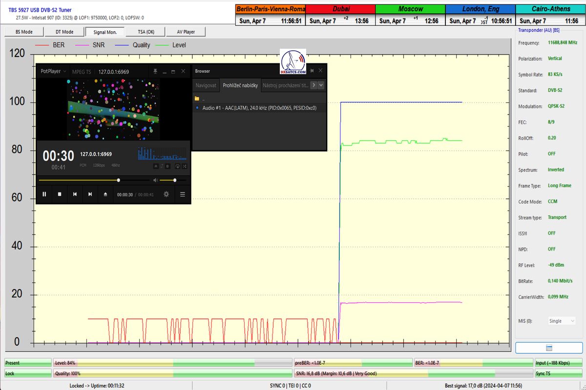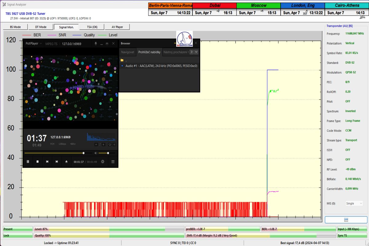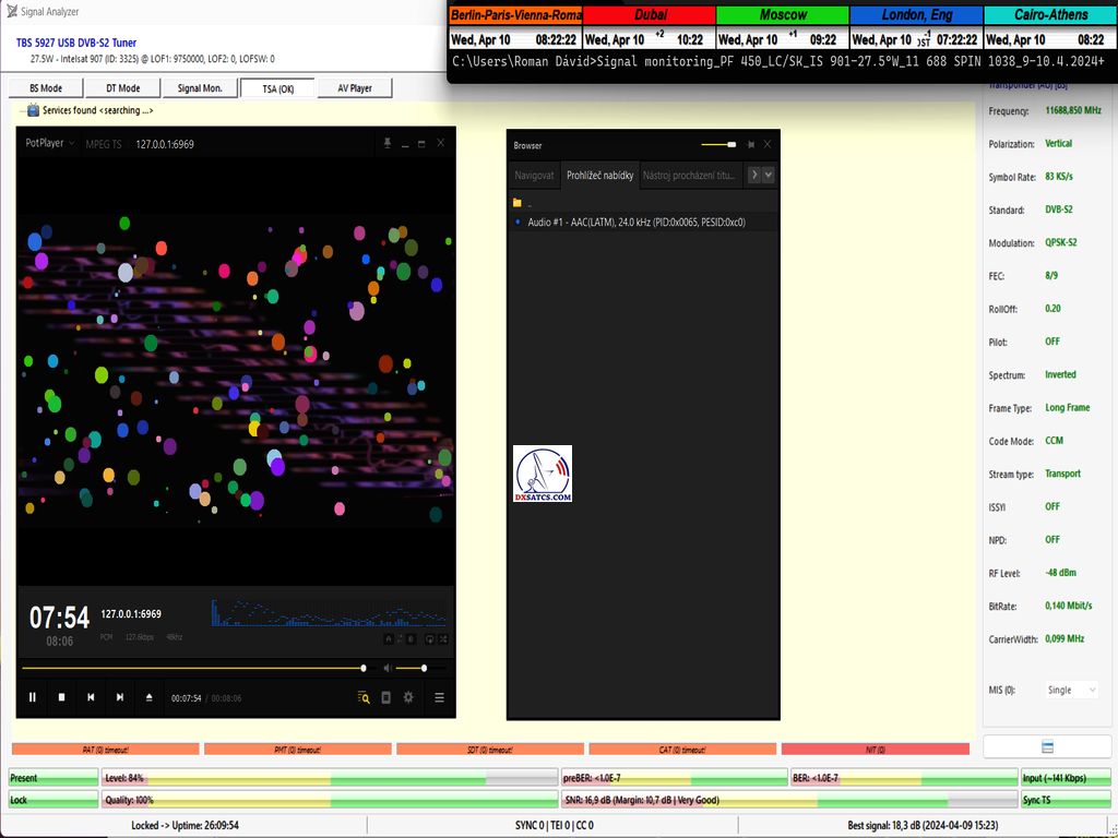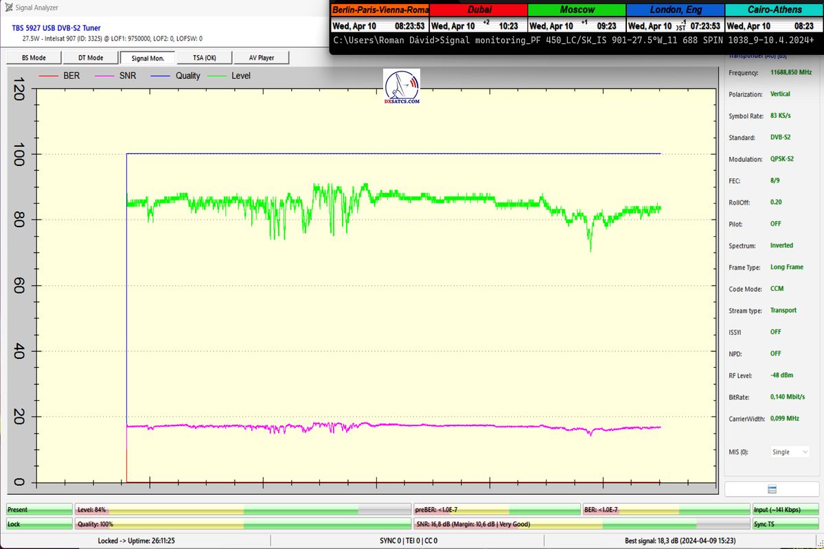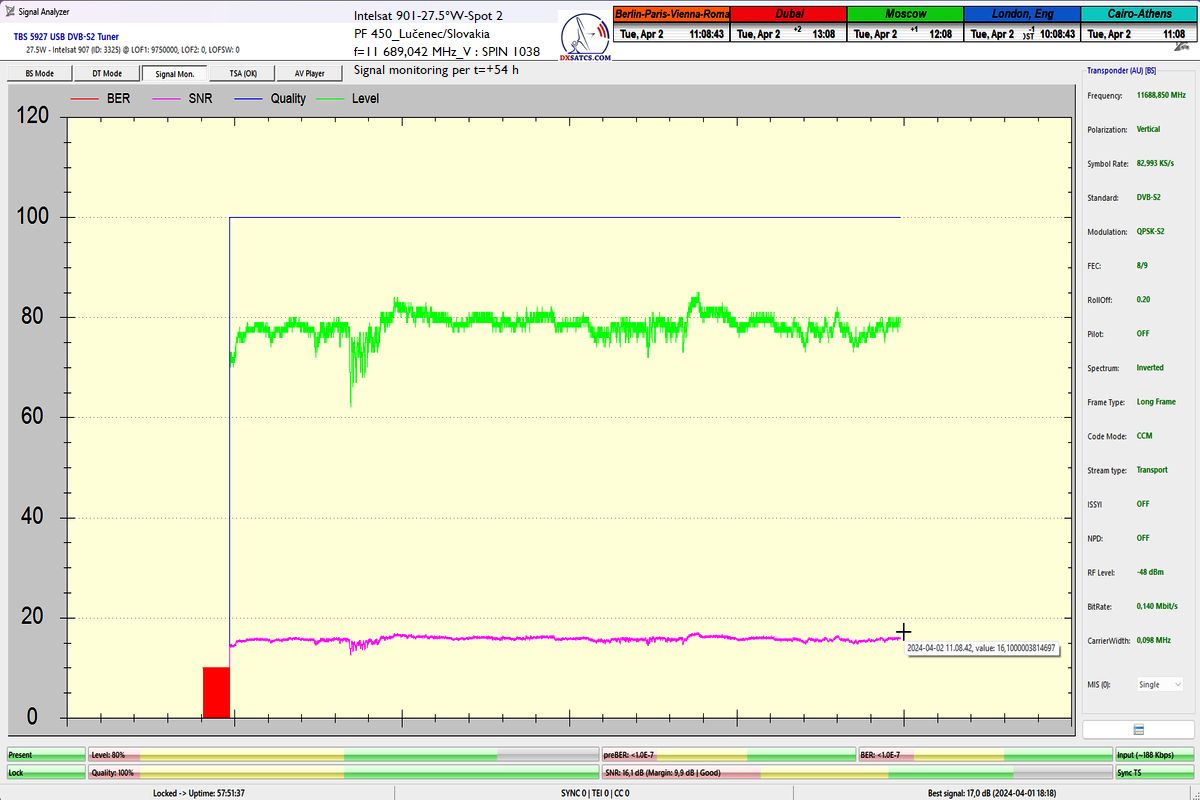 English:The first case study in Europe by the author Roman Dávid from Lučenec,in which,in the verification unit of monitoring at t=77 hours, unquestionably proves that the HW/SW configuration of the PC card TBS 5927 and the EBSpro program allows achieving demonstrably stable reception even at the lowest symbol rates (SR),specifically SR=83 ksym/s,under the operating system Windows 11,assuming successful application
