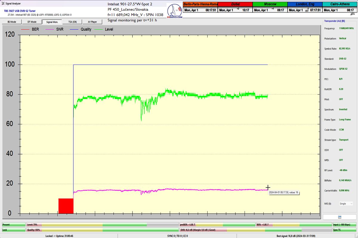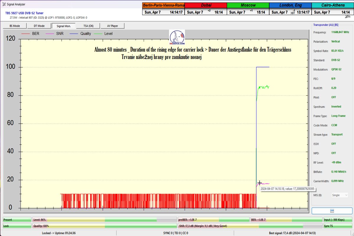 ►Auf Deutsch_Klassifikation der erreichten Ergebnisse bei f=11 689,042 MHz: Das Signalmonitoring in der Einheit t=77 Stunden beweist zweifelsfrei,dass ich ein konstantes LOCK-Verhalten mit einem Spitzen-SNR-Qualität von 17 dB erreicht habe,ohne Unterbrechung in der Kontinuität der Q-Qualität,mit anderen Worten,einen nachweisbaren Empfangsstabilität des Radiosenders SPIN 1038 mit SR=83 ksym/s zu 100%.