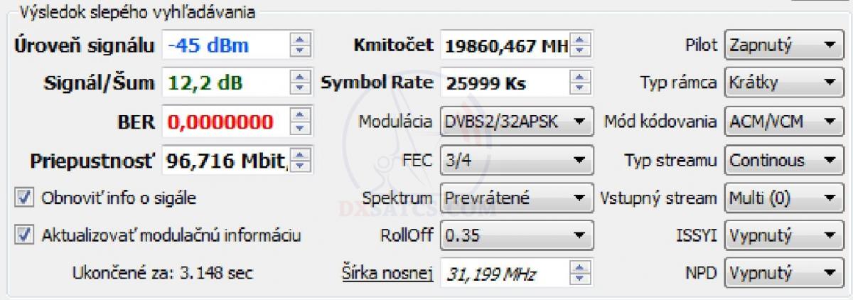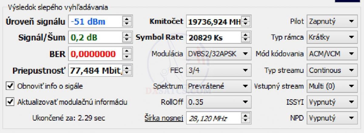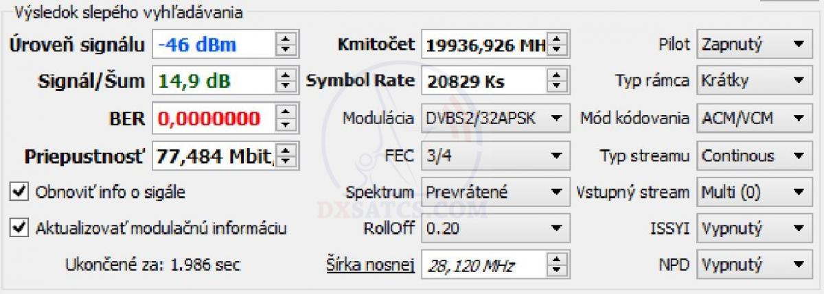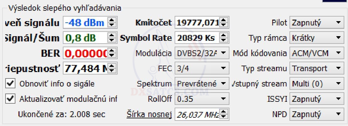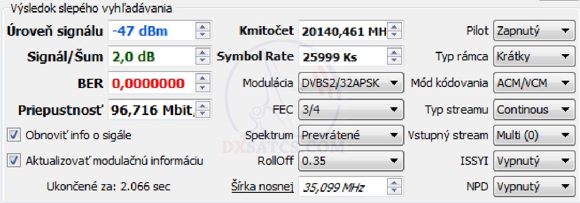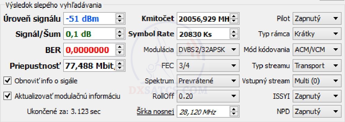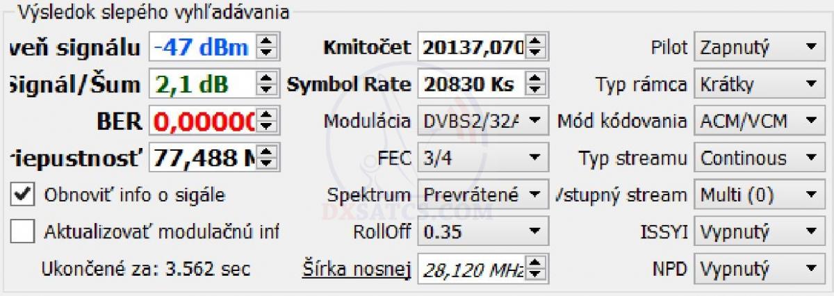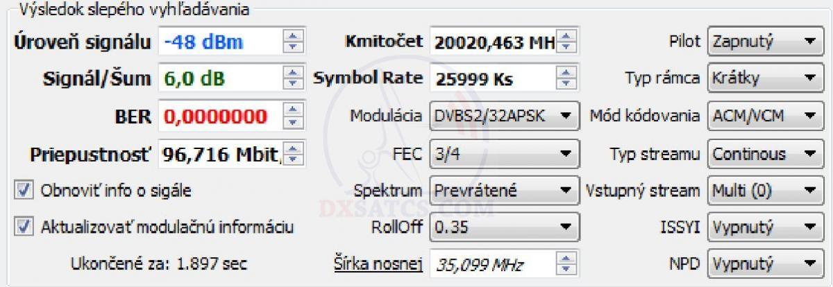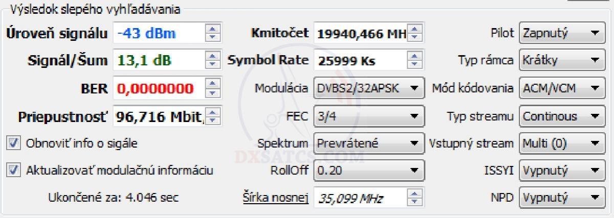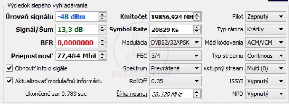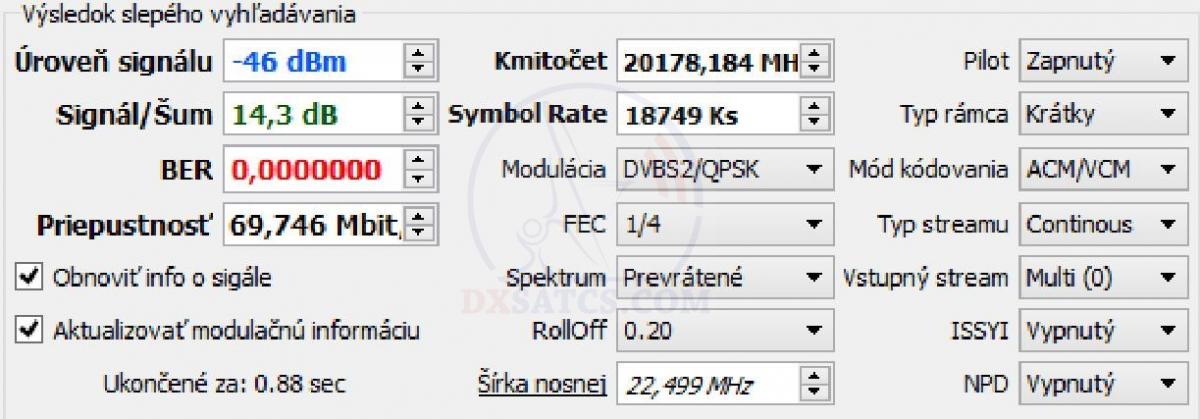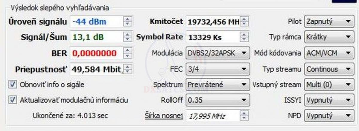 na f=19 700,5 MHz+19 702,5 MHz+19 707,5 MHz a na f=20 680,5 MHz v spektre RHCP vektora dopadla úspešne čo vylučuje akékoľvek