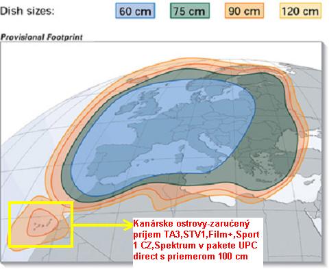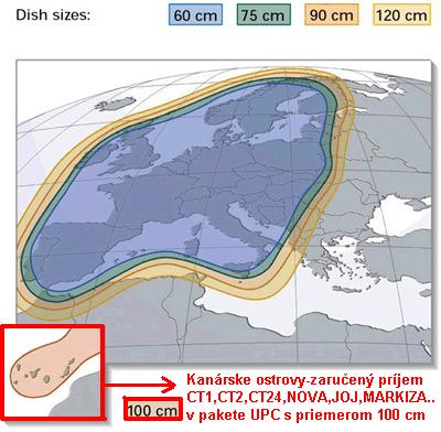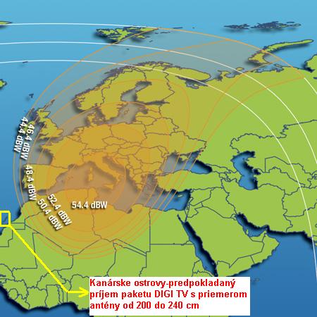 Na jednoduchom príklade Vám popíšem možnosti zachytemia programovej ponuky z družice INTELSAT 1002 z orbitálnej pozície 1,0°západne,ktorú využíva k prenosu paket platenej DIGI TV Slovensko,o ktorého sledovanie na Kanárskych ostrovoch máte záujem. Rád by som na začiatok podotkol,že osobne som príjem paketu DIGI TV neotestoval v podmienkach príjmu na Kanárskych ostrovoch,ale budem vychádzať z mapy pokrytia signálom - viď. FOTOGALÉRIA č.1,v ktorej provajder družice definuje veľkosť antény z hľadiska polohy na zemskom povrchu.