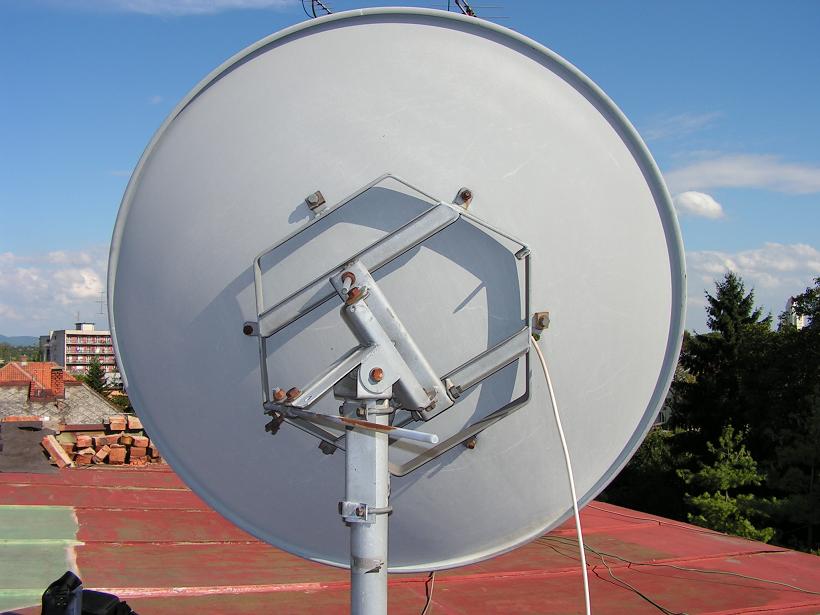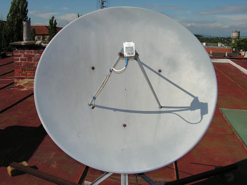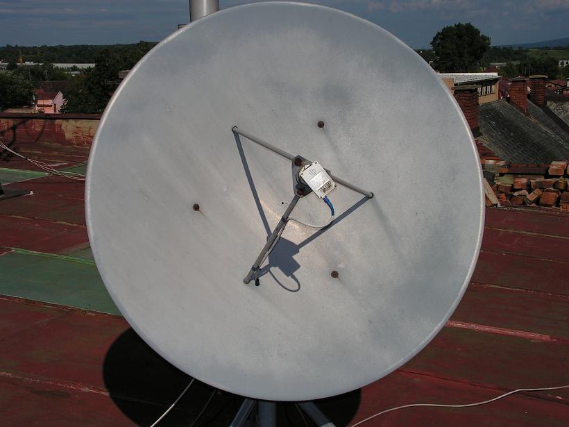 PREDSTAVENIE ZISKOVEJ STREDOVEJ PRÍJMACEJ ANTÉNY ZNAČKY KOVOSAT V POLÁRNOM UCHYTENÍ S PRIEMEROM 120 cm ULOŽENEJ NA ORIGINÁLNOM STATÍVE.
