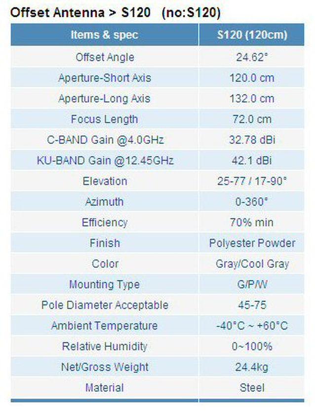 measurement results are derived from the 120x132 cm diameter offset antenna