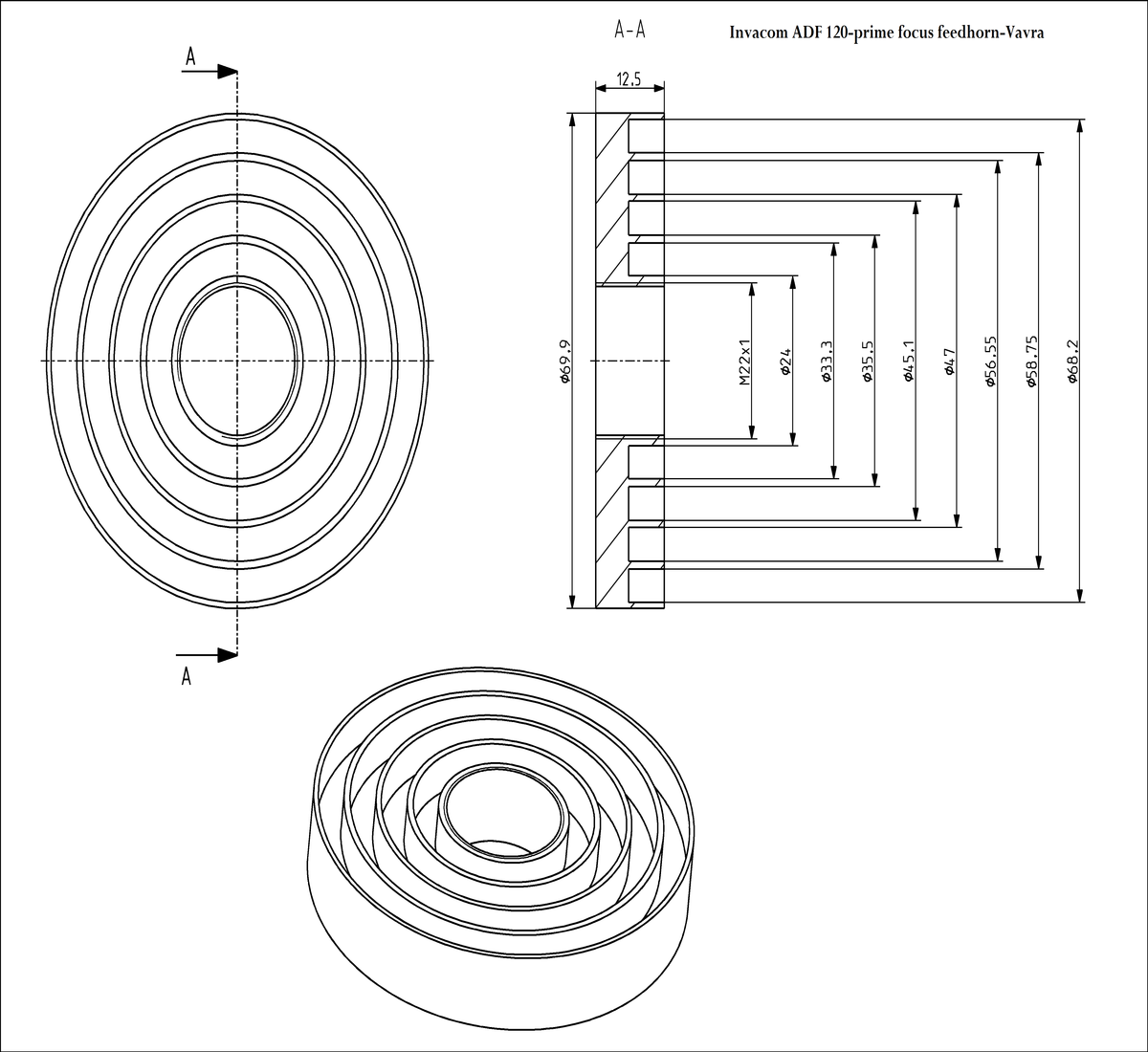 Nafotil som Vám opätovne stredový ožarovač ,ktorý sa dodával pre stredové antény typu Kovosat od diametru reflektora 90 cm po 140 cm , kde som presne popísal v akej vzdialenosti /presne 22 mm podobne ako priemer vstupu ožarovača/ od ústia-čiže vstupu ožarovača po kónickom poklese priemeru s bližšie nedefinovaným klesaním v mm na jednotku 1/2 palca, nastáva prechod na konštatný priemer kruhového vlnovodu 17 mm,ktorý pokračuje až do výstupu ožarovača .